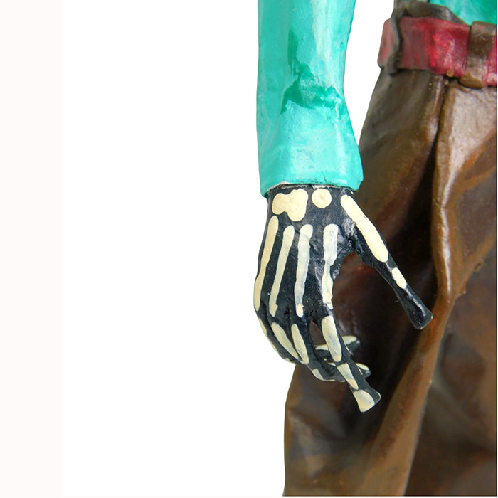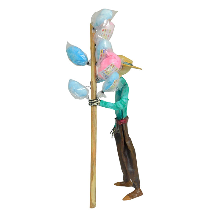 Fantastic Cotton Candy seller skeleton, paper mache sculpture, handmade in Mexico City. This seller with his sombrero is dressed in formal attire. This Day of the Dead paper mache figurine is very well formed. The cotton candy pole serves to balance the skeleton.