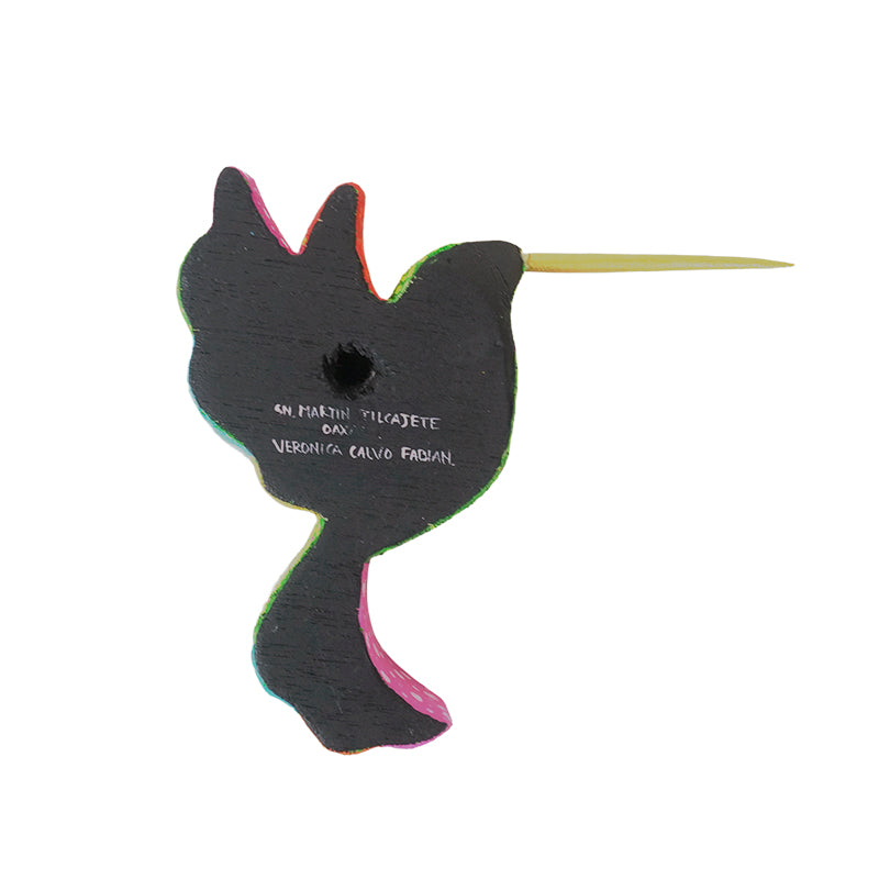 This beautiful hand-carved hummingbird by Oaxacan artist Veronica Calvo is a burst of life and color frozen mid-flight. With wings outstretched and beak pointing forward, it captures the lightning-fast energy of the real bird while dazzling with vibrant artistry. Painted in a vibrant palette of greens, pinks, purples, oranges, and yellows, its feathers glow with intricate geometric patterns and delicate dot work, adding both motion and depth to the piece.