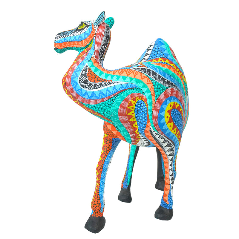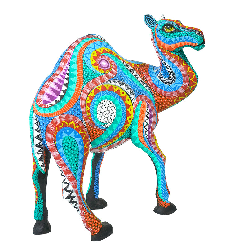 This lively camel by Oaxaca's  Neftali Martinez of Tribus Mixes is an explosion of color and pattern. Its body is covered in swirling mandala-like designs, tiny scales and triangles, and rivers of dots in turquoise, coral, yellow, red, and violet that flow all around the hump and legs as desert winds turned into paint. Bright, alert eyes and inky black hooves give it a wonderfully animated, almost storybook presence.