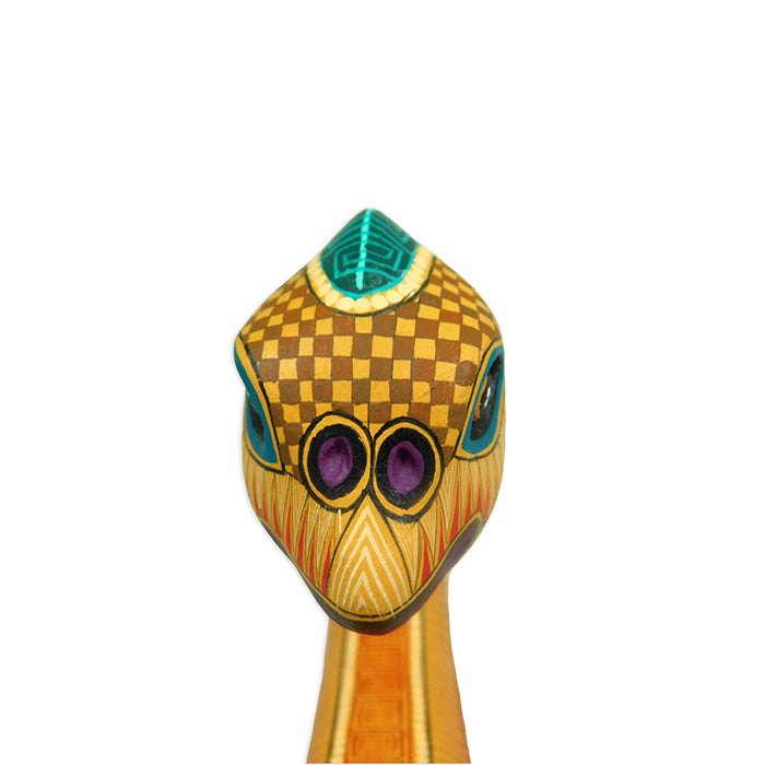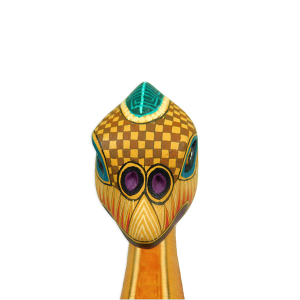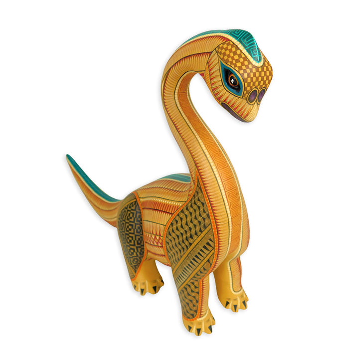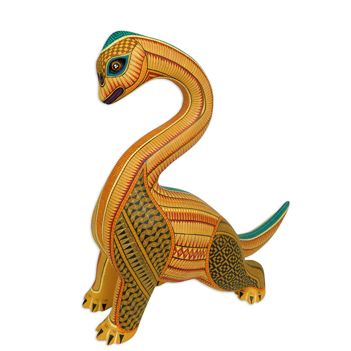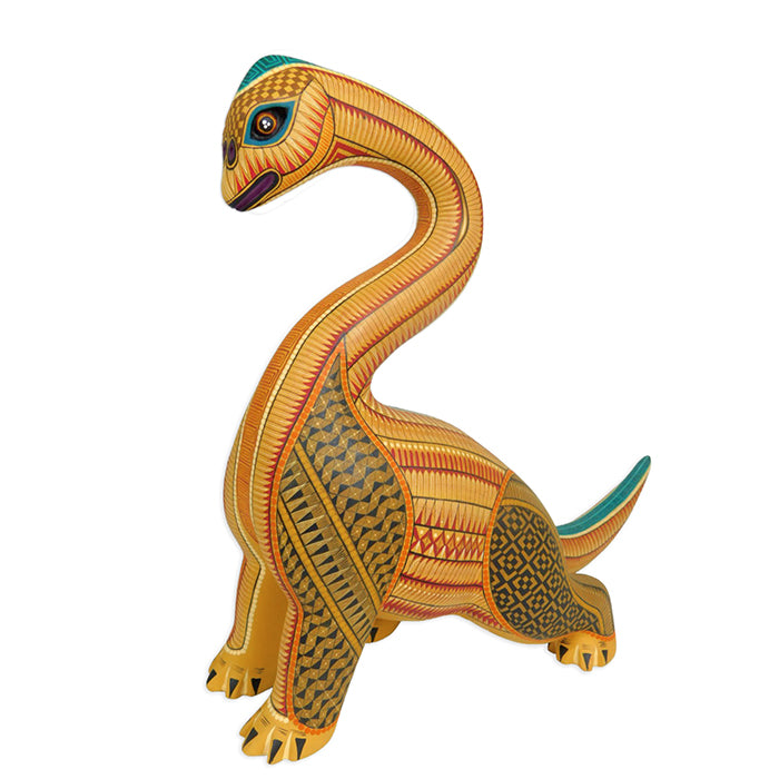 Neri and Soledad create some of the most beautifully painted woodcarvings in Oaxaca, and this piece is no exception. The majestic Jurassic creature is expertly carved, accurately depicting the Brachiosaurus that once roamed North America. Take a look at the close-up picture of Soledad's painted design!