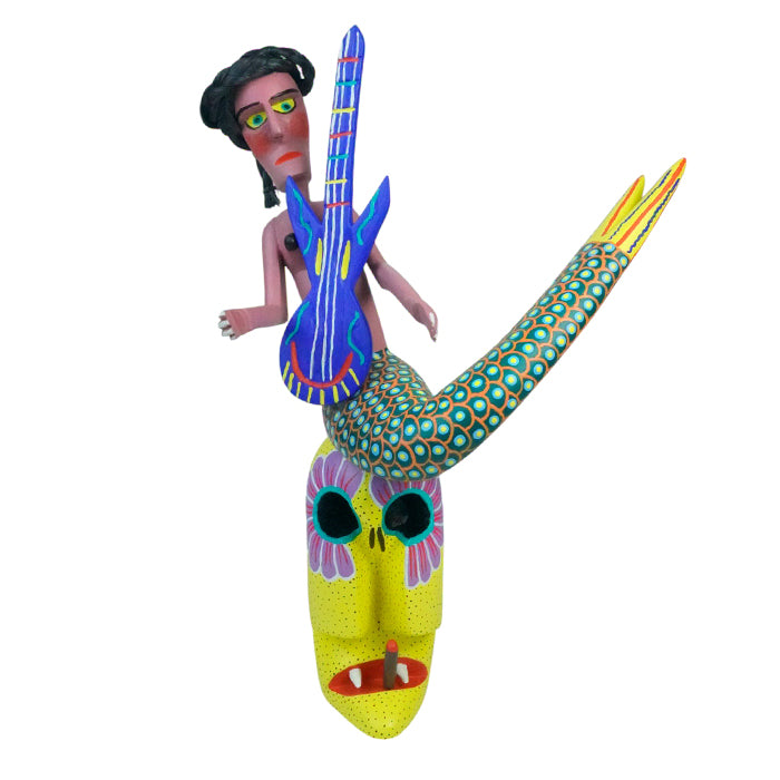 Fantastic sirena, mermaid in Spanish, with her guitar on a skull by Oaxacan woodcarving artist Adrian Xuana. Origin:...