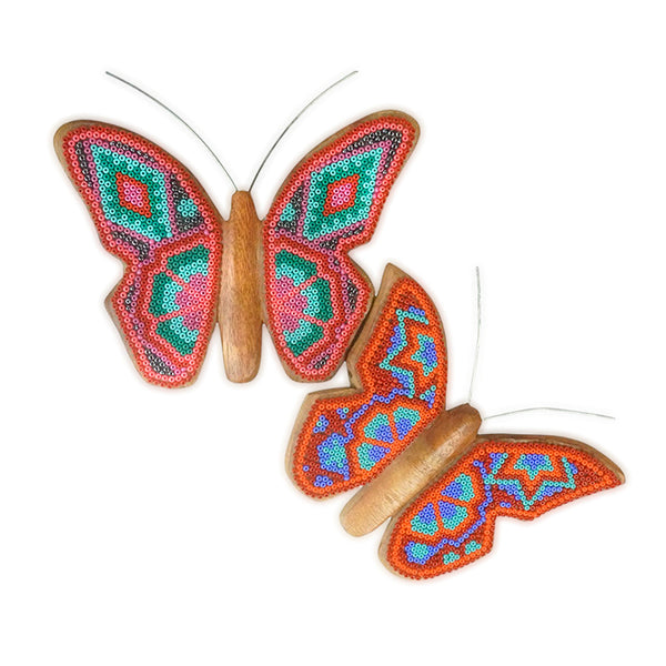 Gorgeous Huichol butterflies handmade by Wixarika artists. Each colored bead is placed one by one over a thin layer of Campeche wax, creating a stunning design. The butterflies can be hung on a wall or placed horizontally.