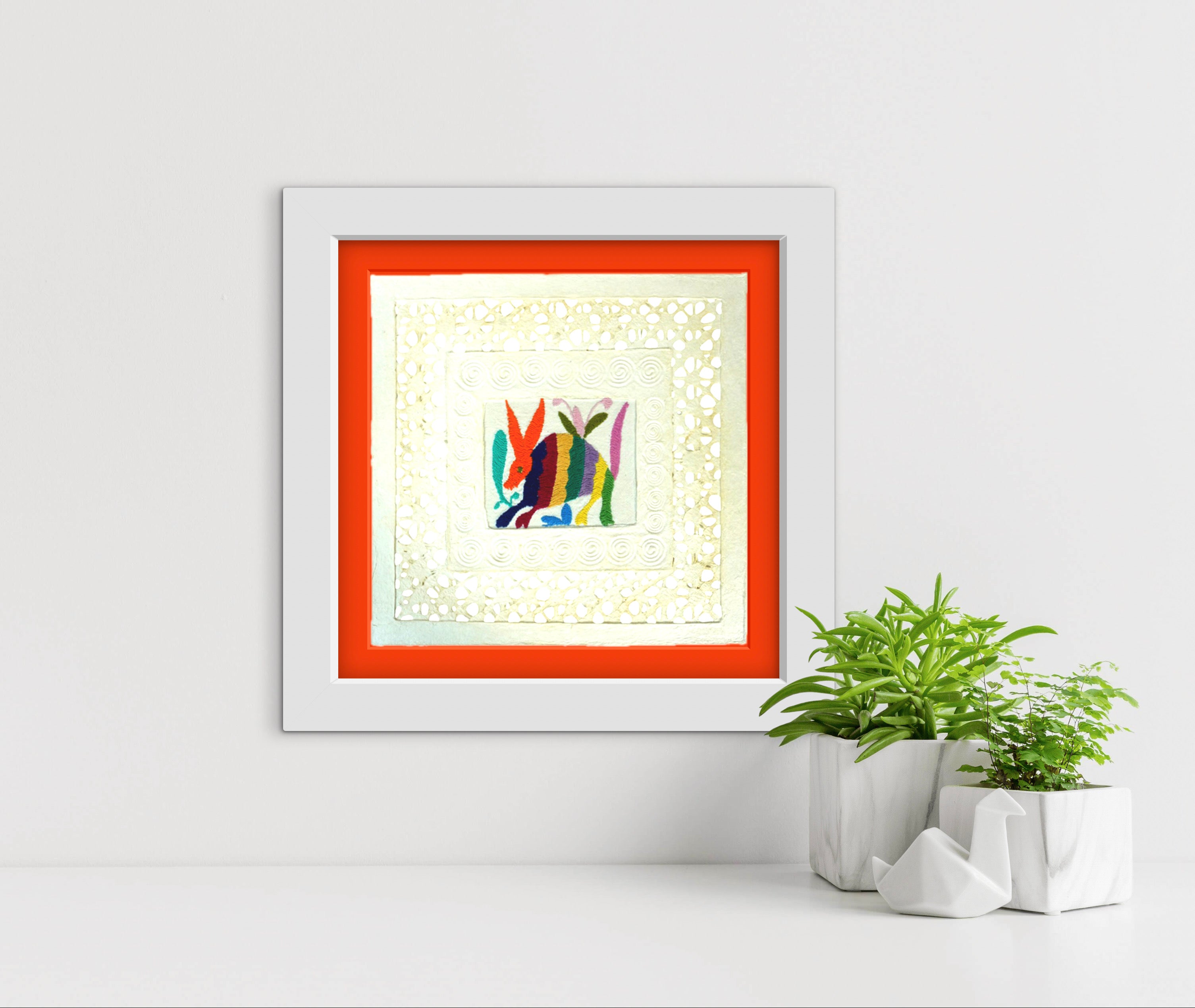 At the center, a vibrant hand-embroidered armadillo comes to life in joyful rainbow hues, surrounded by flowers and leaves that celebrate nature’s abundance. The embroidery, stitched with traditional Otomí techniques, is mounted on richly textured handmade paper, embossed with spirals and delicately perforated edges reminiscent of papel picado.