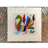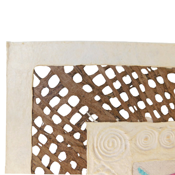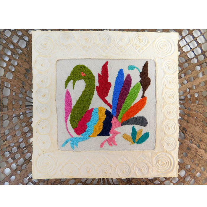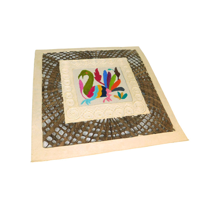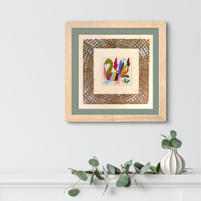 Lovely mixed media wall art peacock art piece. The handcrafted bark paper is made in Puebla, Mexico using ancient pre-Hispanic methods of paper making. At the center of the piece, is a square cotton cloth hand embroidered with a bright peacock. The embroidery is handmade in Tenango Puebla and placed at the center of the moist paper. The natural bark colored perforations are in reality strands of paper woven while the paper is wet. Beautiful!