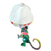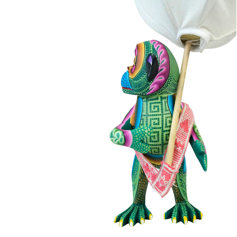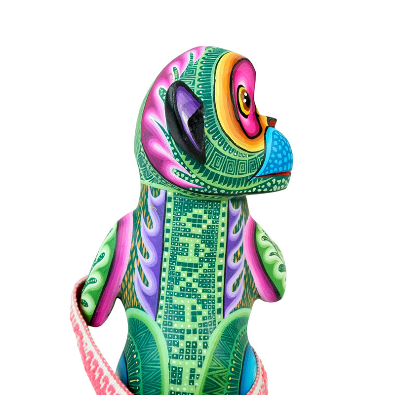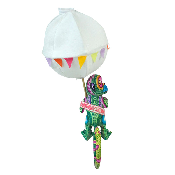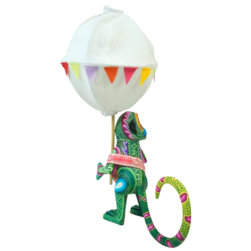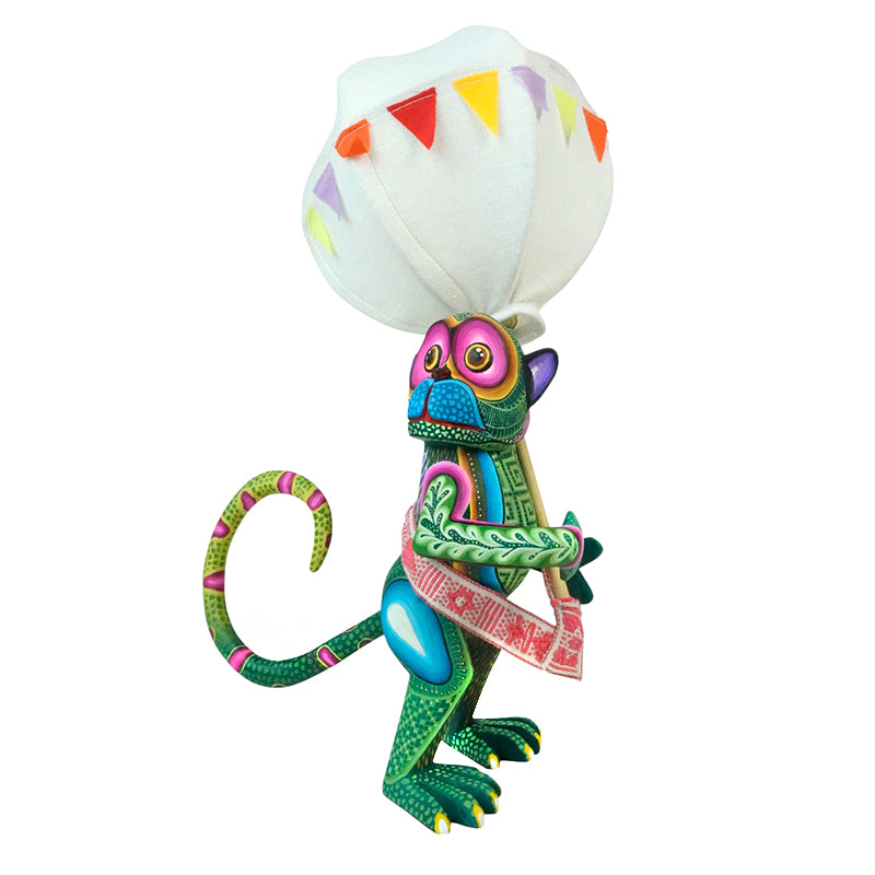 This joyful alebrije by Carolina Sandoval captures the spirit of celebration and cultural pride. A vibrantly painted monkey, rich in greens, purples, and aquamarine, carries a white calenda balloon adorned with miniature papel picado-style pennants in festive hues. Carolina sewed the balloon by hand. The monkey itself is carved in a lively, animated posture, with wide, curious eyes and finely painted textures that reflect Carolina's signature style: intricate, balanced, and full of life.