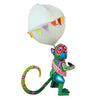 The monkey wears a hand woven red sash from Jalieza, Oaxaca, diagonally across its chest, a nod to traditional Oaxacan attire worn during parades and fiestas. The balloon it holds high is a symbolic centerpiece of Oaxacan festivals, especially the Guelaguetza.
