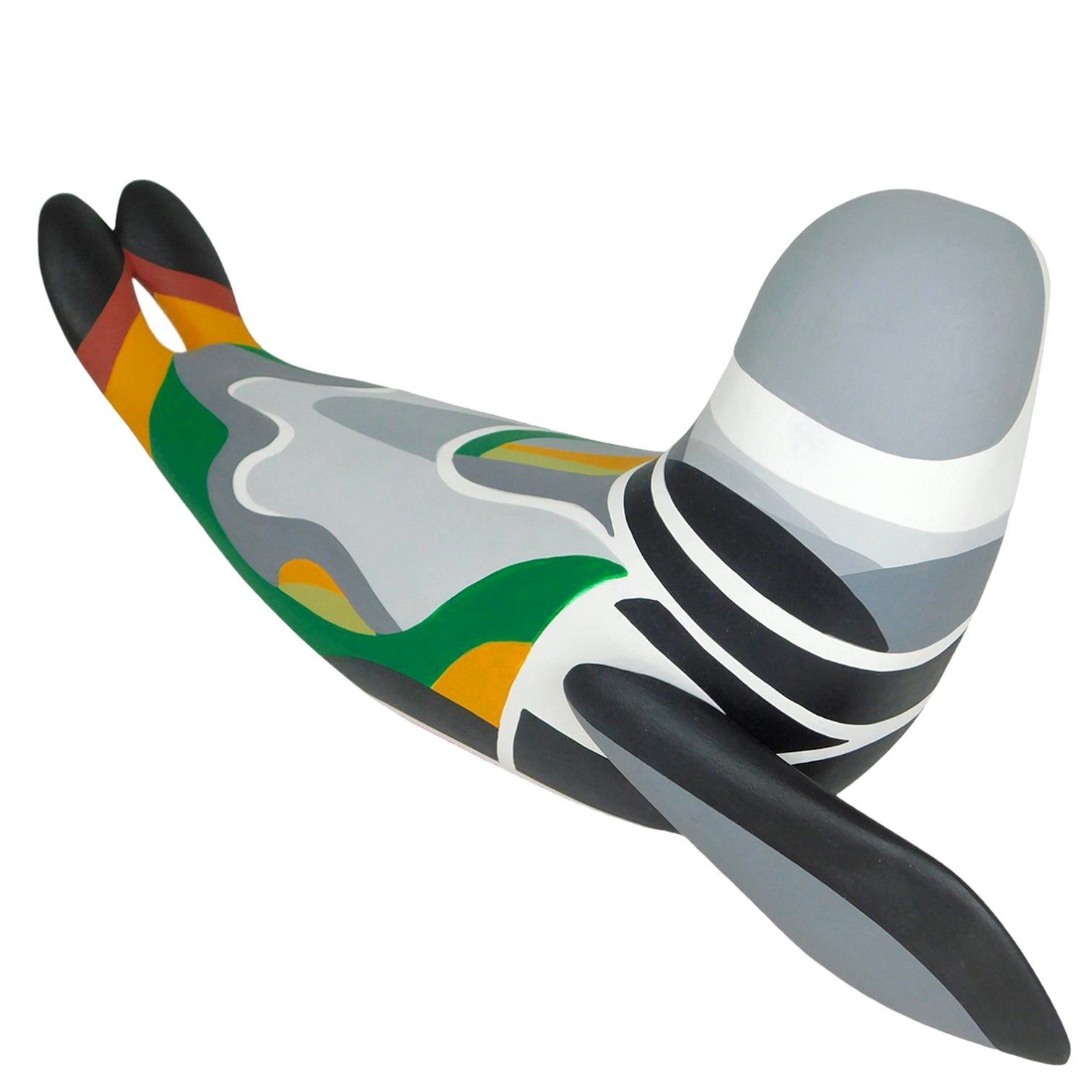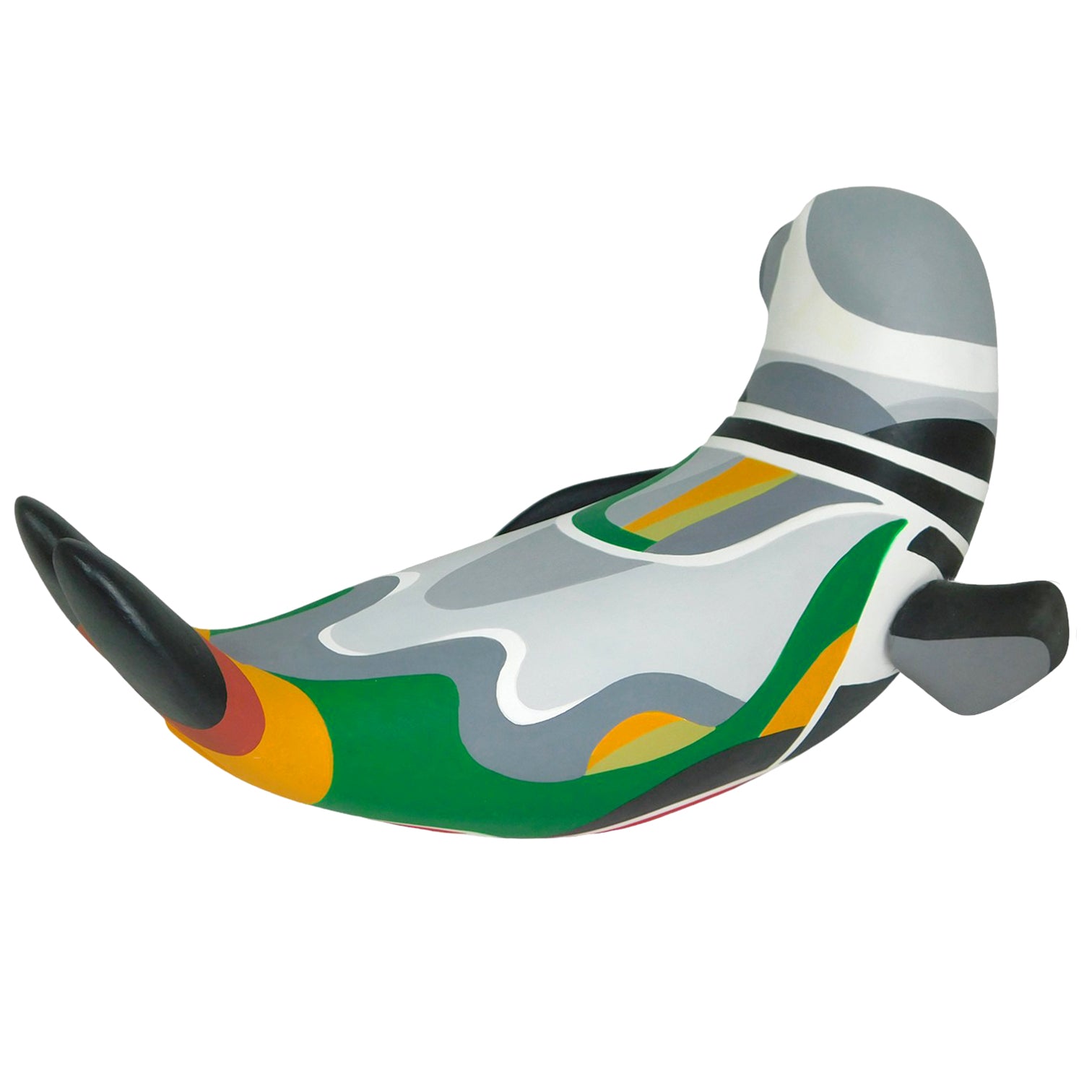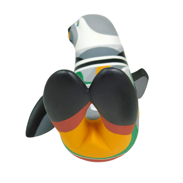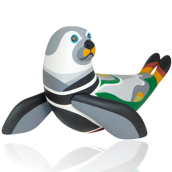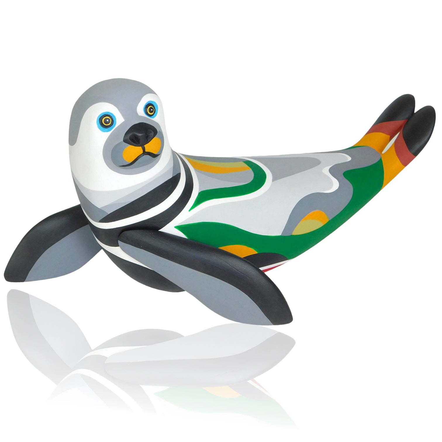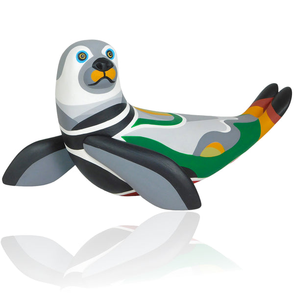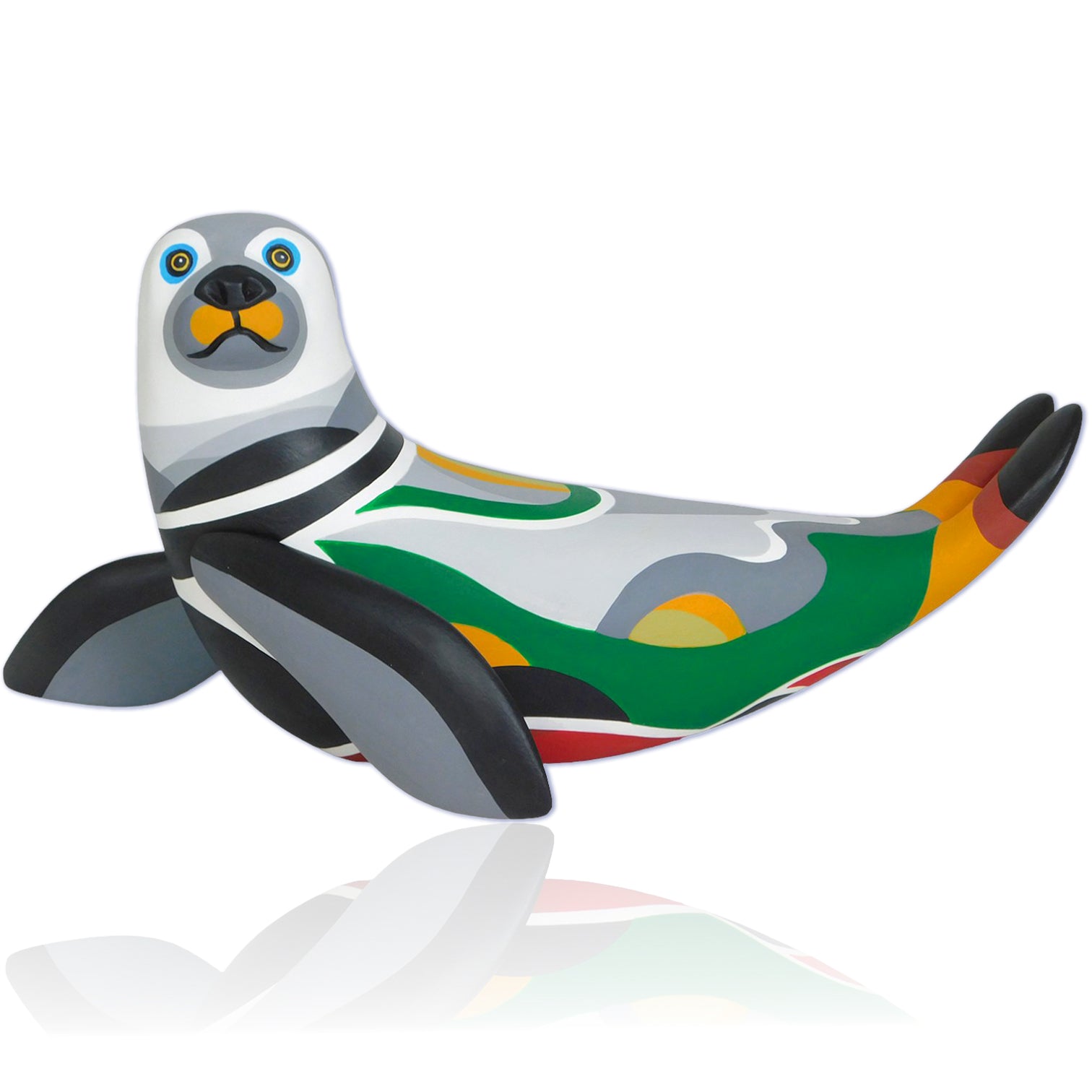 Stunning large seal woodcarving by top Oaxaca woodcarving artist Luis Pablo.  Luis is recognized for his innovative wood sculptures and contemporary use of color and painting techniques. This fabulous seal has a modern design of wave-like patterns in beautiful complementary colors. The flippers give the illusion of being in movement!