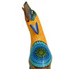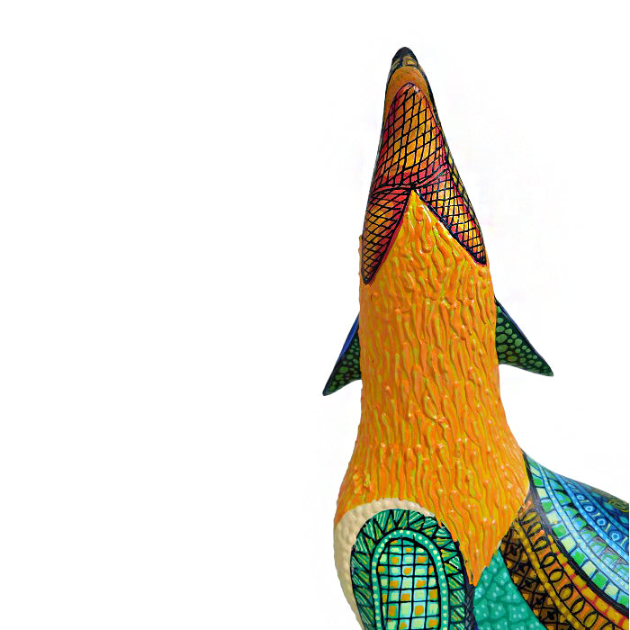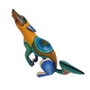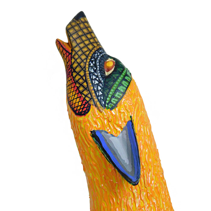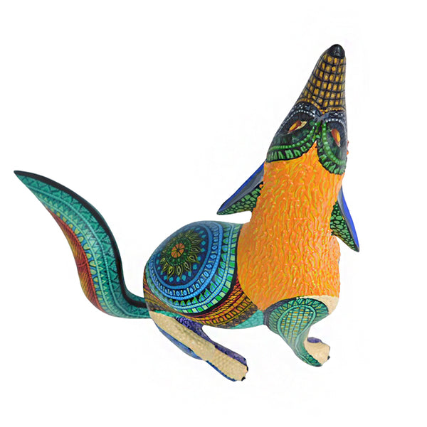 This woodcarving of a howling coyote is incredibly attractive and was created by Oaxaca artist Margarito Melchor Jr. The figure has been expertly carved and features a unique textured painting design. Margarito is an artist worth keeping an eye on, as he is sure to become one of the top artists in the field in the near future.