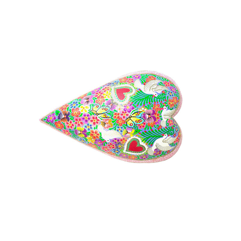 Lovely carved wood heart by well-known Oaxacan artist Maria Jimenez. The heart is decorated with beautiful doves, hearts, butterflies, and flowers. It can be hung on a wall or placed horizontally.