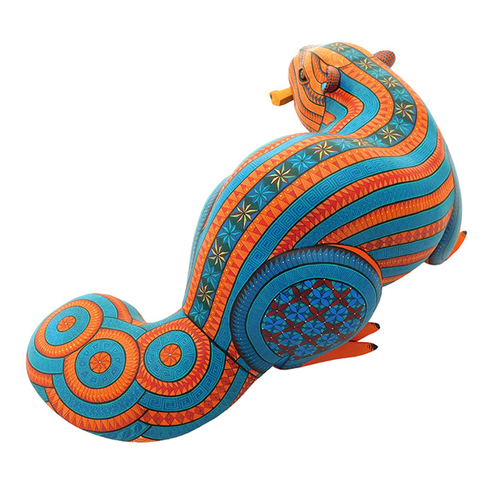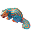Stunning beaver wood sculpture by rising star Oaxacan woodcarving artist Diego Ramirez. The one-piece castor is perfectly carved with a spectacular curving tail. Diego's design and painting are impeccable. Look at the gorgeous painting on the tail and back of the animal! The beaver seems to have different body language when viewed from different angles. It's a gorgeous piece!
