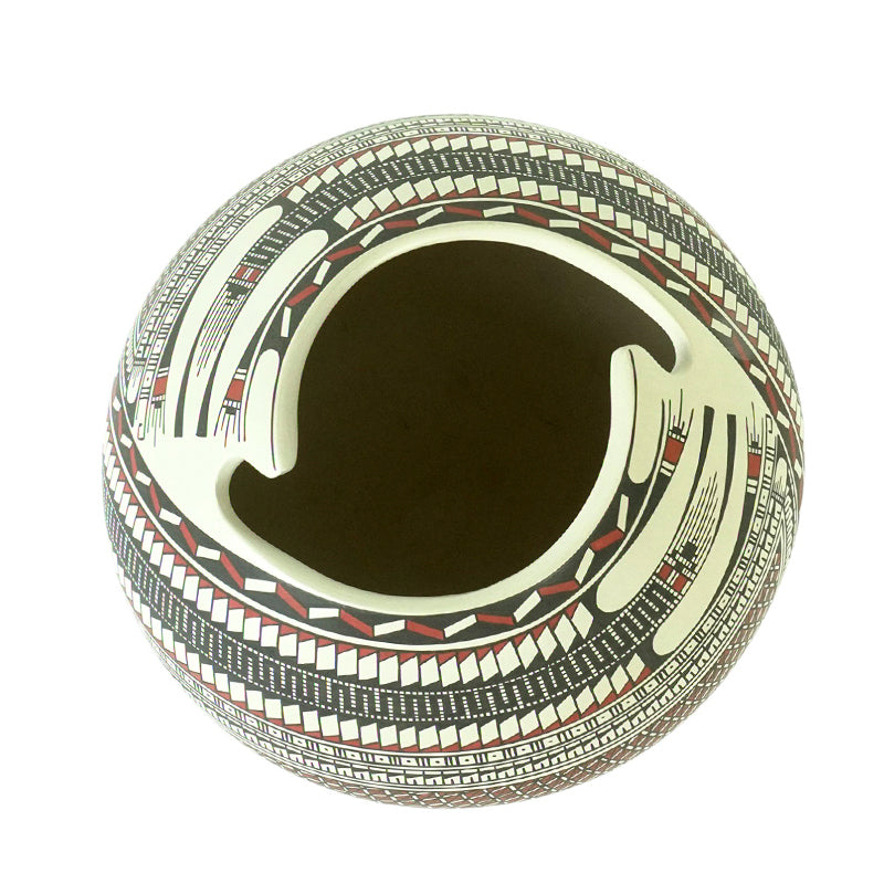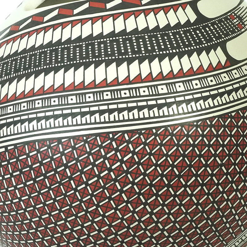 The contrast between the crisp white background and the rich red-and-black patterning gives the olla a striking, almost optical effect, at once traditional and very modern.