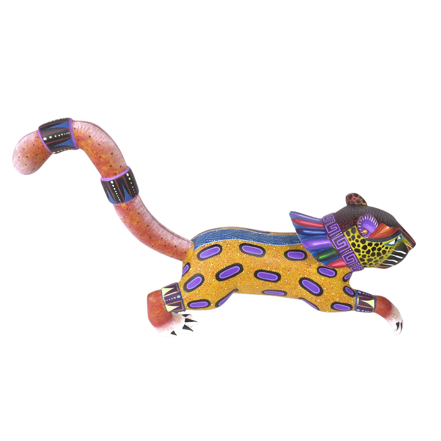 The jaguar’s face is adorned with geometric motifs inspired by Aztec design, and a colorful feathered collar pays homage to ancient warrior adornments. With its dynamic stance and vivid patterns, this piece embodies the strength, agility, and spiritual significance the jaguar held in Aztec mythology — a sacred creature bridging the realms of earth and the divine.