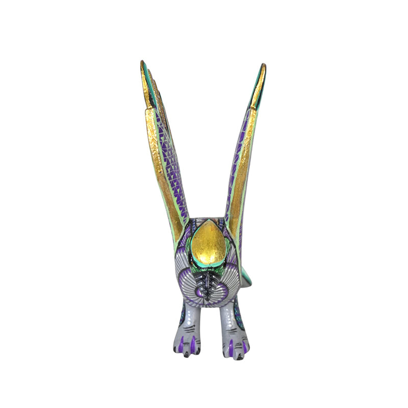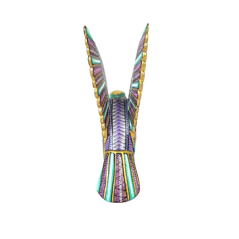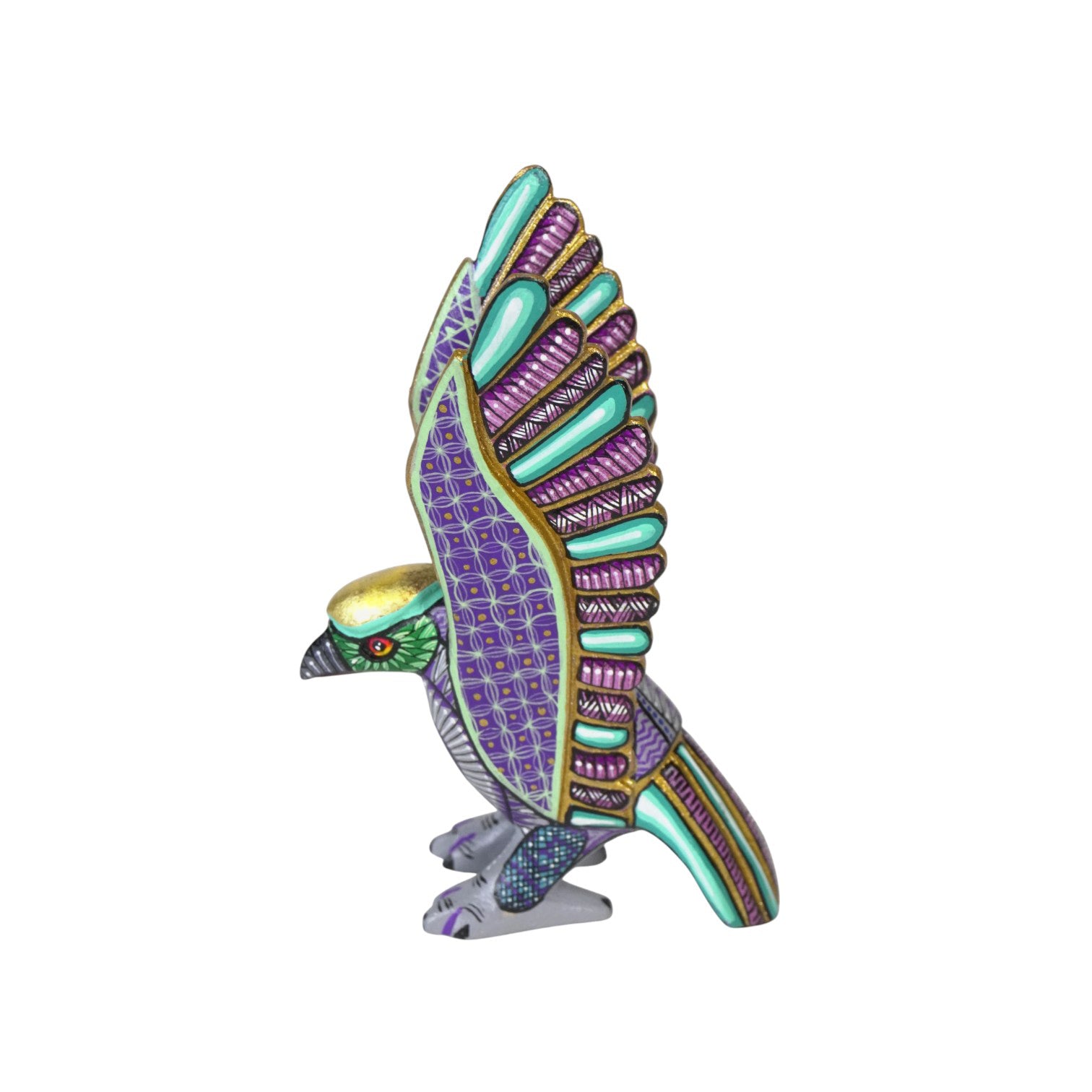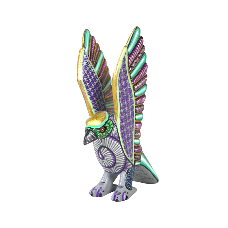 The painting is a feast of metallic and jewel tones. Vázquez combines luminous gold on the head and wing edges with deep purples, emerald greens, and cool silvers, creating a regal, almost ceremonial presence. Each feather is defined by tiny geometric patterns—triangles, diamonds, and lines that echo pre-Hispanic motifs, so the wings read like finely woven textiles. Seen from the back, the stripes of turquoise and lilac along the tail and flight feathers give the eagle a radiant, almost armor-like plumage, as if it were a guardian bird from a legend.