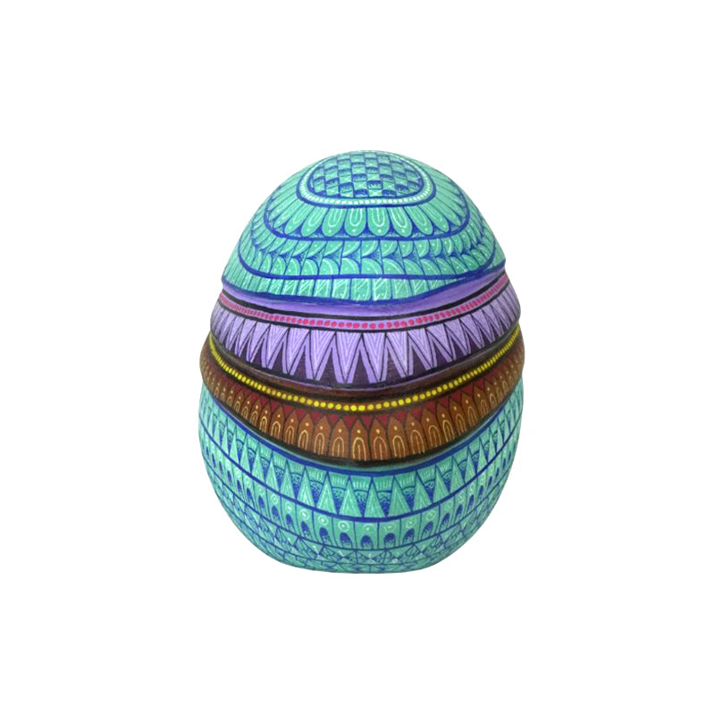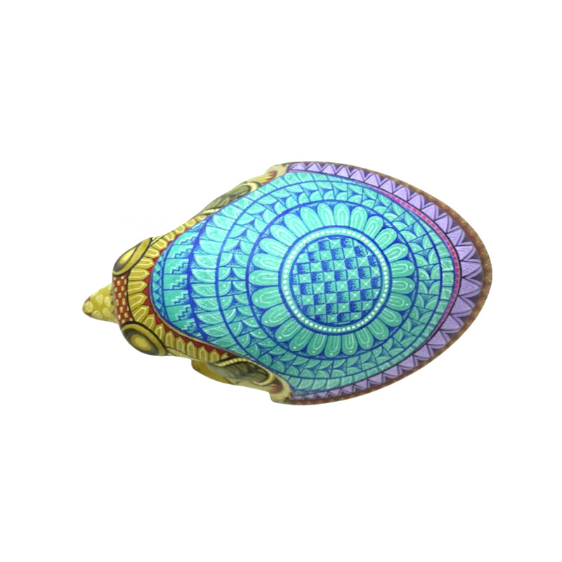 This stunning armadillo is the work of Omar and Areli Cruz, a young and exceptionally talented husband-and-wife team from Oaxaca. Omar carves each figure with flawless precision, capturing graceful form and balance, while Areli brings it to life with her extraordinary painting skills. The detailed patterns covering the shell—layered in turquoise, lavender, gold, and crimson, are executed with remarkable control and symmetry. Every line and dot reflects patience, artistry, and harmony between two creative spirits working as one.