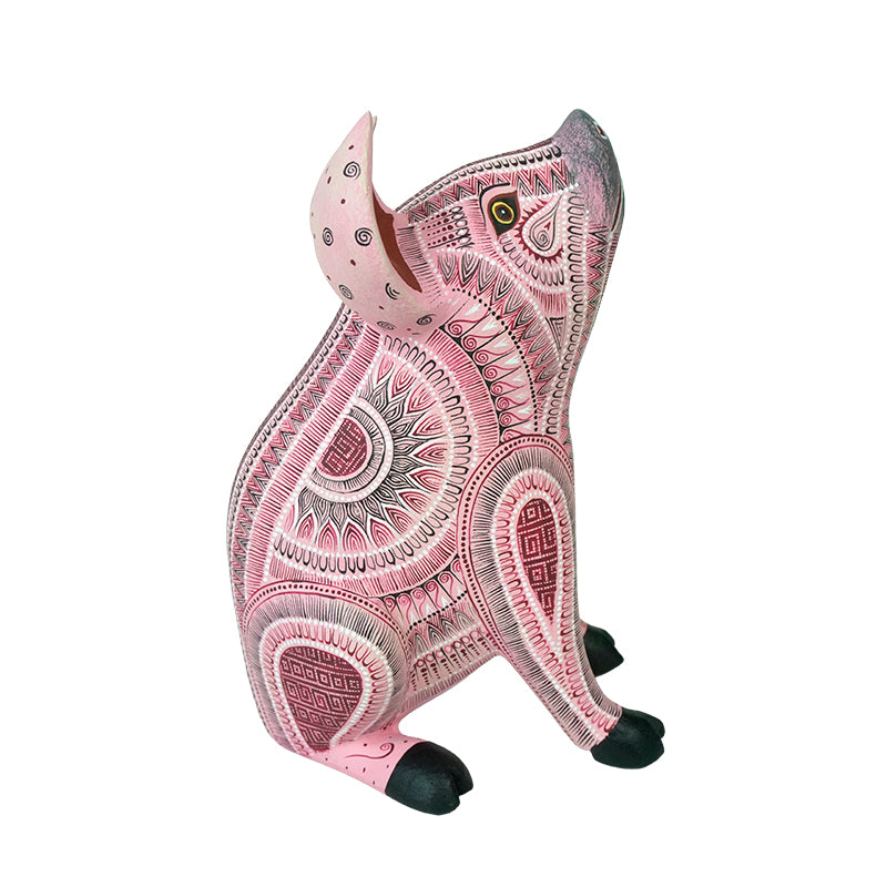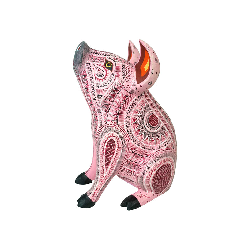 This adorable little piglet is an exquisite example of fine Oaxacan woodcarving by Rocio Fabian, part of a new generation of artists who have taken fine line painting to an extraordinary level. Her pieces are instantly recognizable for their exquisiteness: layers of tiny lines, dots, grecas, and petal shapes that flow in mandala like patterns over the entire carving.
