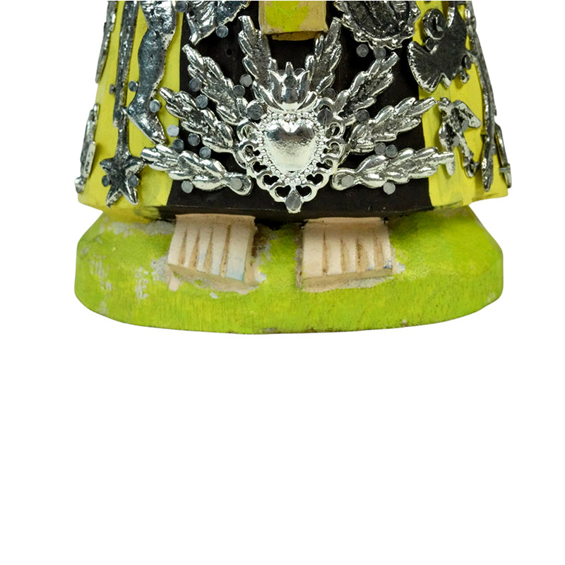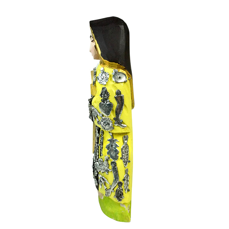 The surface of her robe is richly adorned with Mexican milagros, tiny silver-toned metal charms traditionally used in folk Catholicism as votive offerings to invoke protection, healing, or to give thanks for miracles.
