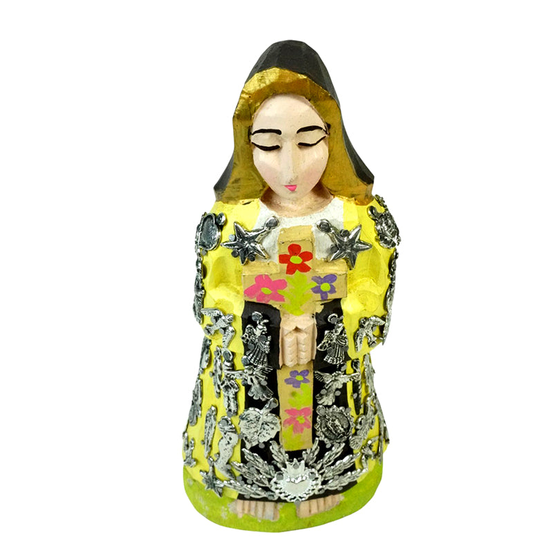 This rustic hand-carved wood sculpture portrays Saint Thérèse of Lisieux, also known as “The Little Flower of Jesus”, in a heartfelt and folk-inspired style. The figure, painted in bright tones of yellow and black, holds a cross adorned with colorful flowers, symbolizing her profound yet straightforward devotion to Christ. Her serene, closed-eyed expression evokes peaceful contemplation and deep inner prayer.