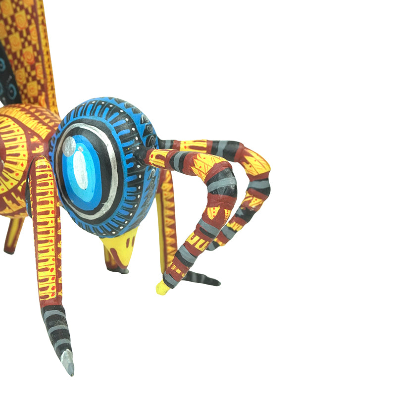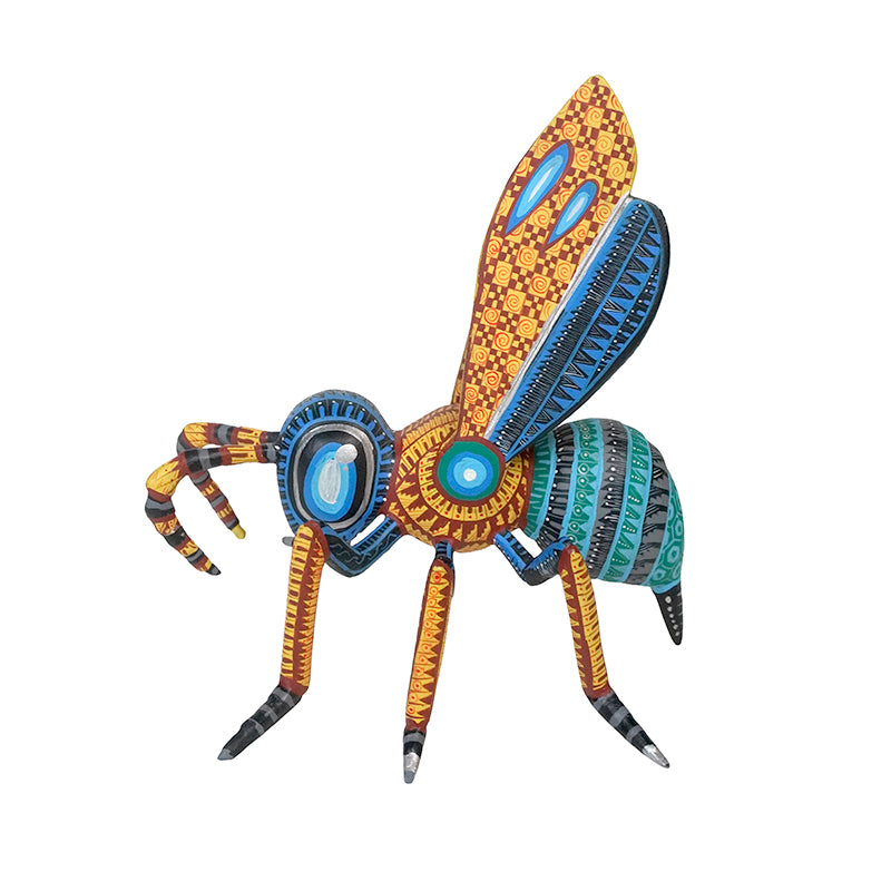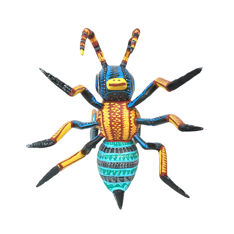 This stunning woodcarved wasp is a little explosion of color and elegance. Its long striped legs, patterned wings, and ringed body are covered in perfectly even, impossibly delicate brushstrokes that highlight every segment of the insect’s form. Antonio Xuana and his family carve each figure from copal wood and then paint it entirely by hand, building up intricate patterns and luminous colors that have become their signature. The result is a powerful, contemporary alebrije that celebrates both the beauty of nature and the artistry of San Martin Tilcajete.
