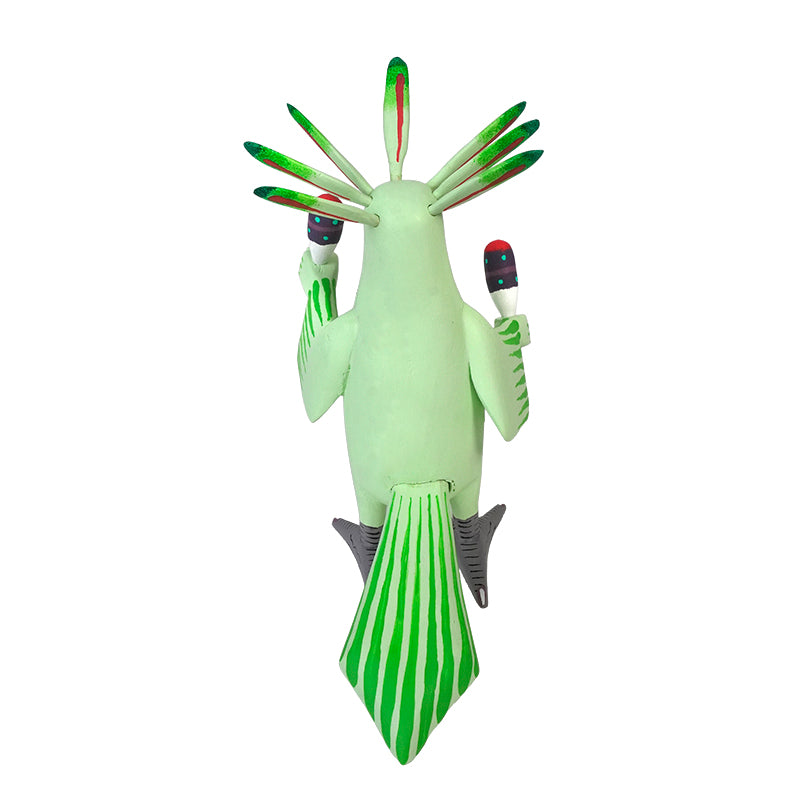 Fantastic punk cockatoo musician by Oaxacan alebrije artist Avelino Perez. The bird is happily playing the maracas, confident that his punk feathers are perfectly straight. Avelino's carvings have that instant “you can’t help but smile” charm: he brings animals, angels, and delightfully mischievous hybrid creatures to life with big personality and a wink of humor.