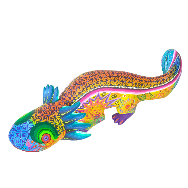This spectacular axolotl by César Melchor looks like it just swam out of a dream. Its long, sleek body is covered in radiant geometric patterns that shift from deep water blues and greens at the head to warm oranges, yellows, and pinks along the back and tail.