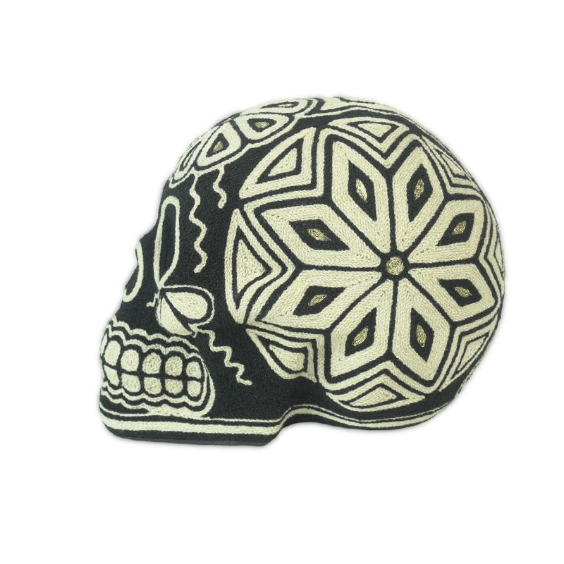 The floral motifs crowning the skull represent rebirth and nature’s eternal renewal. In Wixárika belief, flowers are associated with the earth goddess Tatei Yurienaka, the mother of life. The geometric stars and diamond patterns echo the sacred “Ojo de Dios” (Tsikuri), symbolizing divine vision and protection. These forms also mark the four cardinal directions and the center, representing harmony with the universe.