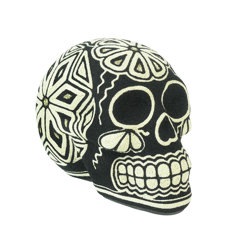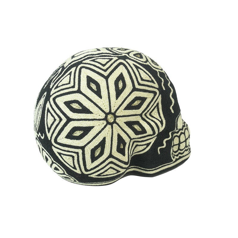 Handcrafted with fine threads pressed into a beeswax-covered surface, this black-and-white design highlights the contrast between life and death, light and shadow, a concept central to Wixárika cosmology. The skull, long a sacred motif in Mexican tradition, honors the cycle of life, reminding us that death is not an end but a continuation in another realm.