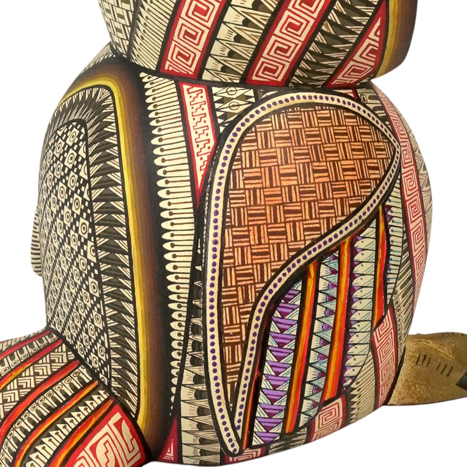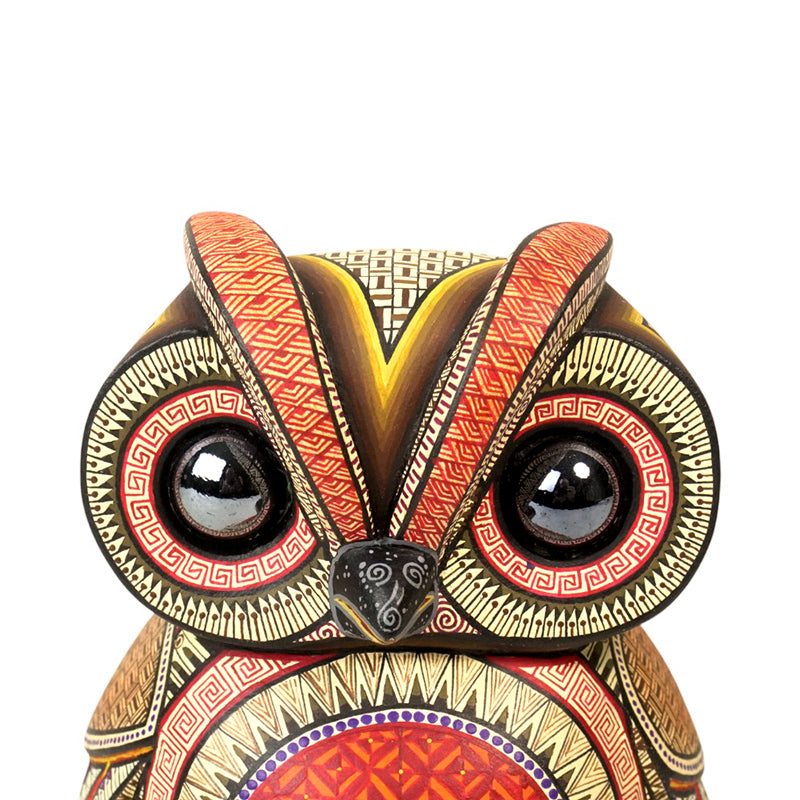 This masterful owl by Javier Jimenez shows why he is considered one of Oaxaca’s top woodcarvers. Every surface is covered with intricate hand-painted patterns, where geometric fretwork and cross-hatched textures create a warm and mesmerizing effect.