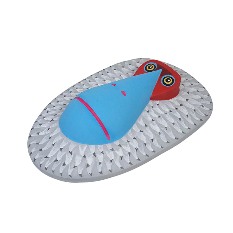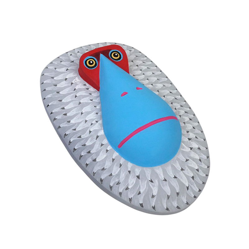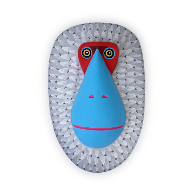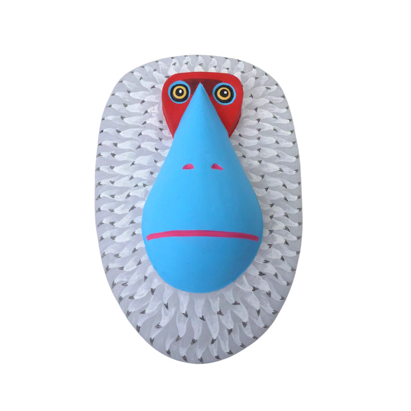 This stunning wooden mask by Oaxaca artist Luis Pablo depicts an orangutan with a striking, bold, and contemporary style. The mask features a teardrop-shaped sky-blue snout that stands out, highlighted by a hot-pink mouth line and small nostrils. Its bright, large eyes with golden irises are set above a vivid red, angular brow, conveying an alert, slightly mischievous expression.