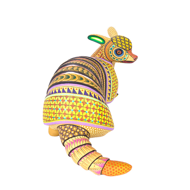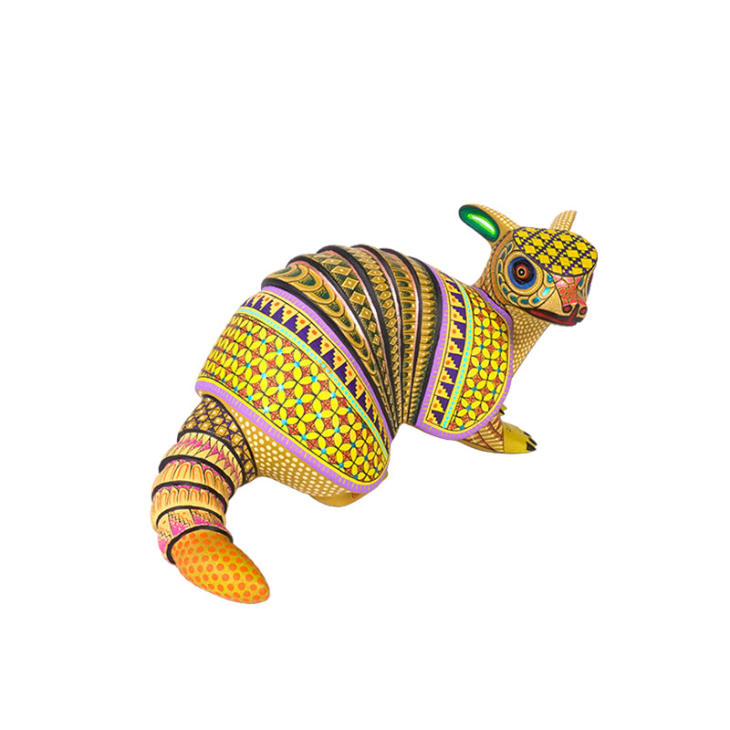 Artists Neri and Soledad Cruz created this spectacular baby armadillo, a married woodcarving team recognized for their wonderful alebrijes in Oaxaca. Its body is covered in intricate geometric patterns, and the rich yellow palette gives the piece a warm, golden glow.
