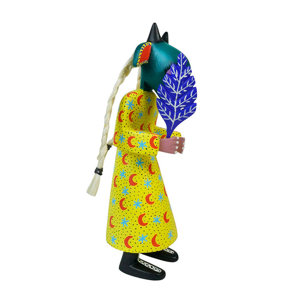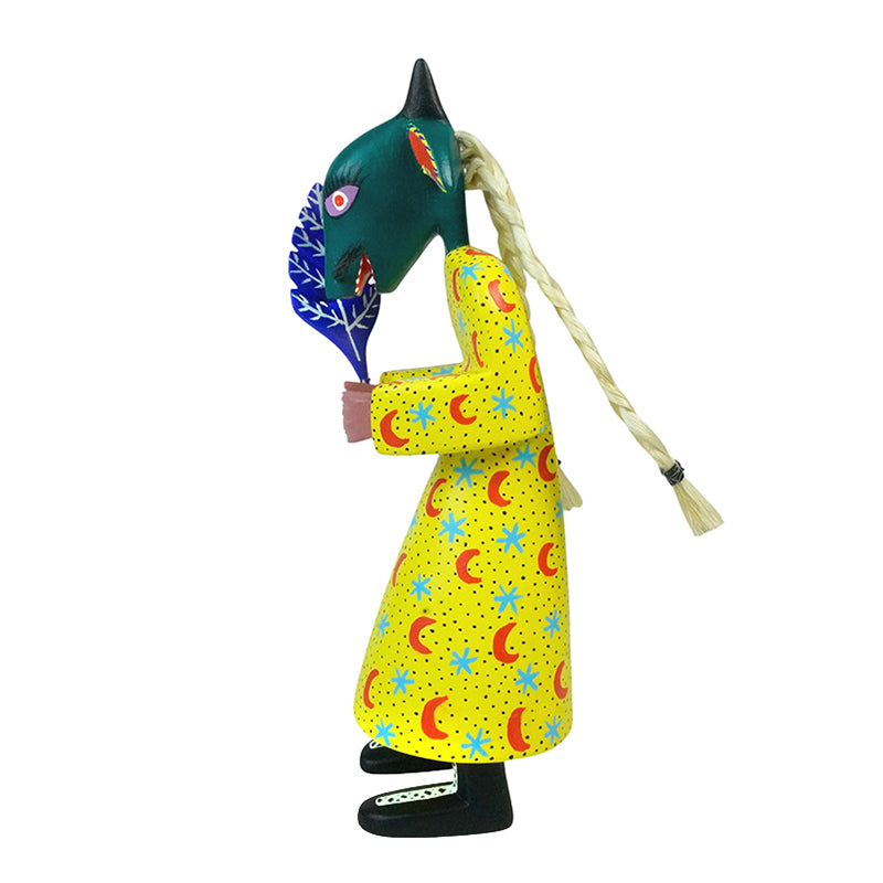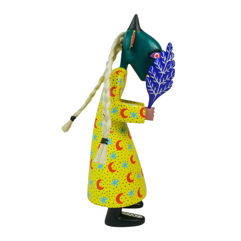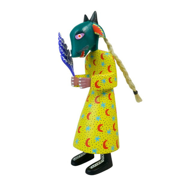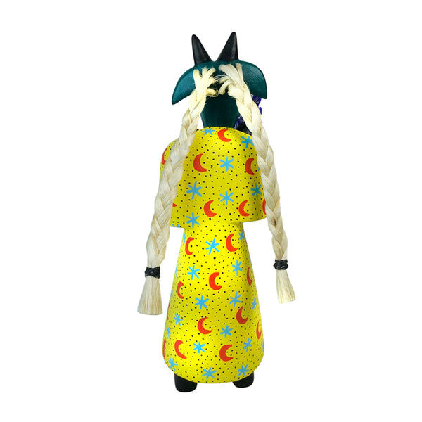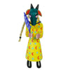 Meet the spell-weaving sorcerer of Oaxaca, sculpted by the inventive hands of Adrián Xuana. Standing tall in a robe as bright as midday marigolds, this whimsical wizard wields a cobalt-blue “feather” staff that seems to pulse with otherworldly energy. Her moon-and-star-spotted cloak shimmered in yellow and red, as if she had plucked the night sky itself and wrapped it around her shoulders. Her long, braided Ixtle ponytail looked like a comet’s tail, even her whiskers seemed poised to twitch in anticipation of the next great illusion.