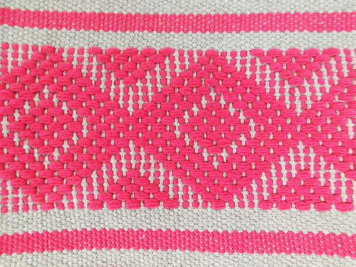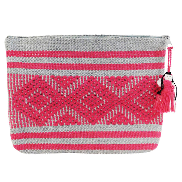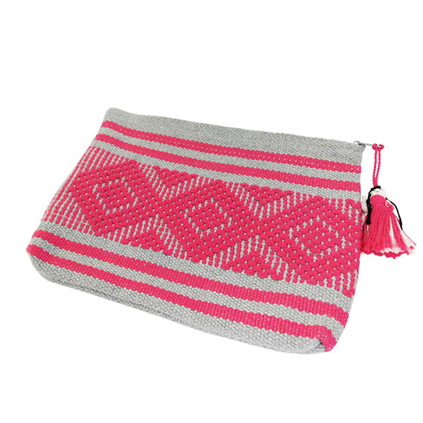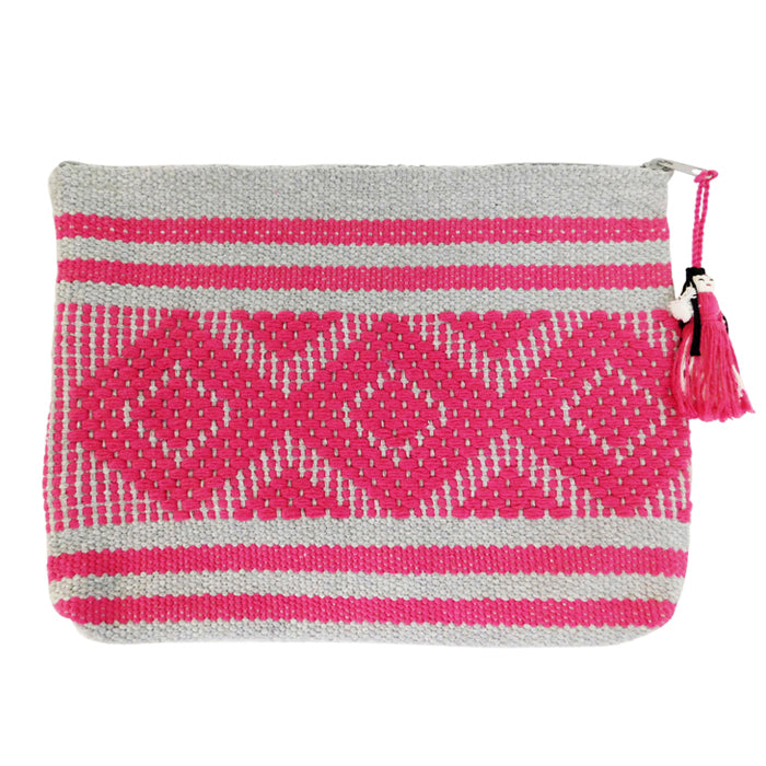 Beautiful handwoven medium size cotton bag with zipper. from Santo Tomas Jalieza in Oaxaca. Jalieza is a small town dedicated to the art of handwoven pieces. It is 25 miles of the City of Oaxaca. This cotton clutch is woven using the ancestral telar de cintura, back-strap weaving loom method. The tassel doll on the zipper is also handmade. Color-matched inside lining.