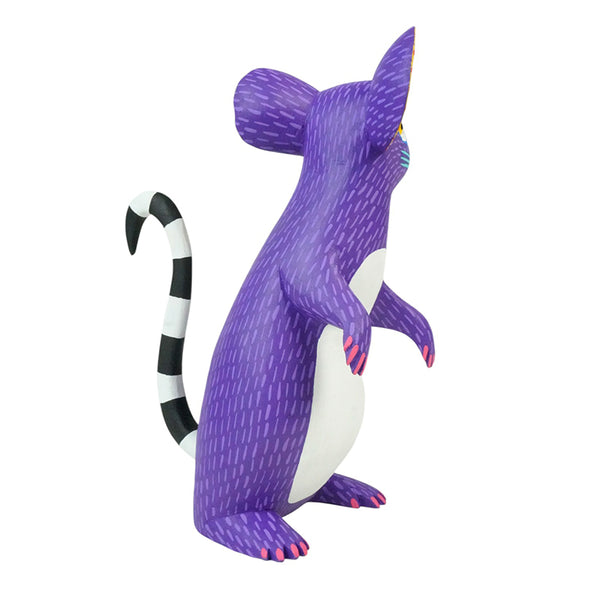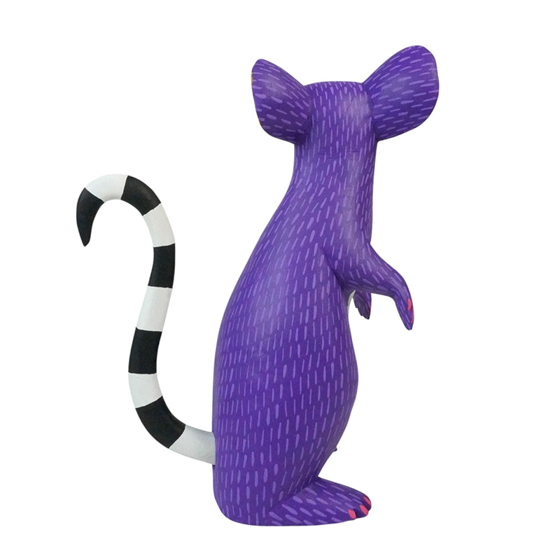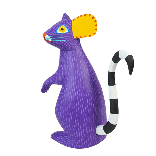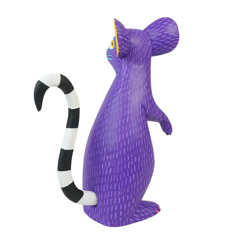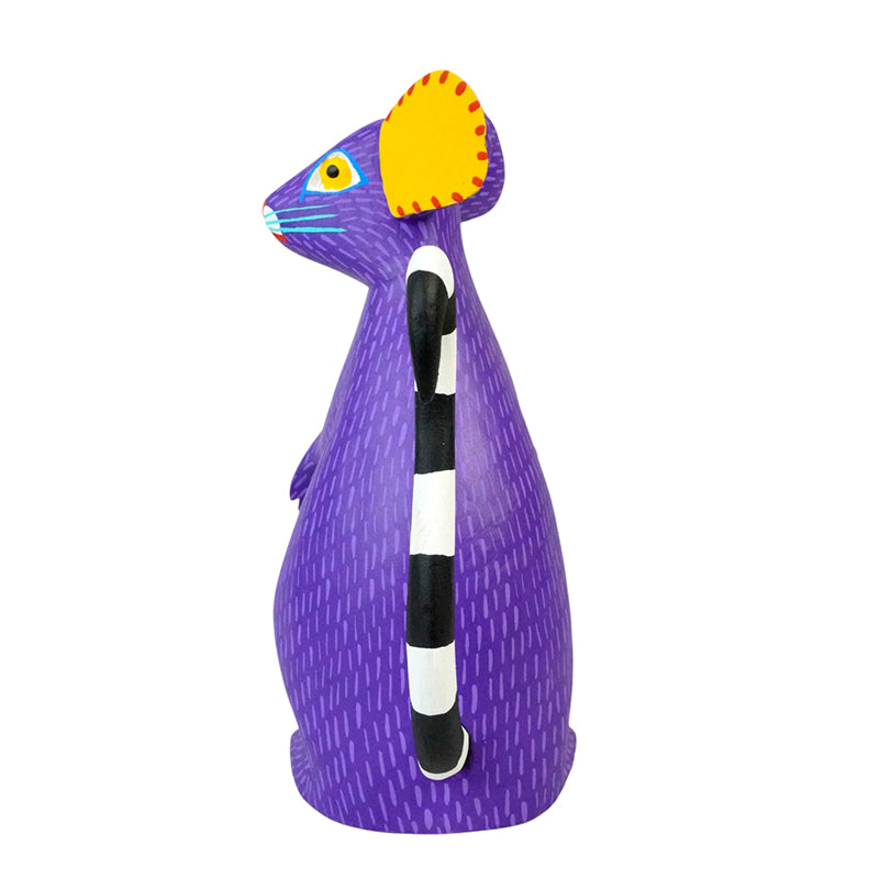 Painted in vibrant purple with bright yellow ears, a striped black-and-white tail, and turquoise whiskers, this charming creature shows off the hallmark style of the Jiménez family, descendants of the legendary Don Manuel Jiménez, the pioneer of Oaxacan alebrijes.