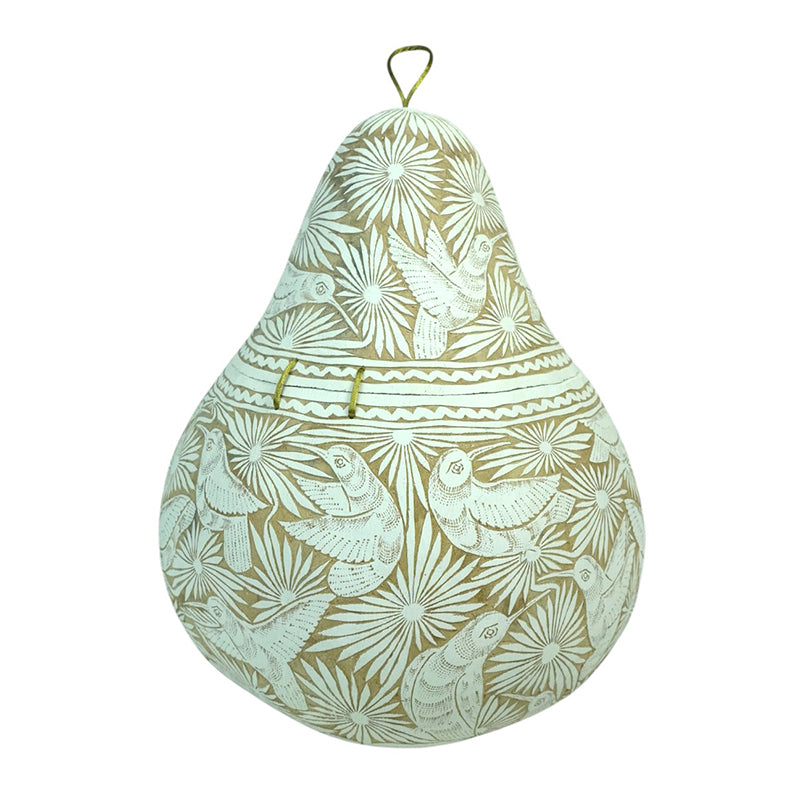 This beautiful natural gourd has been transformed into a work of art through the traditional Huichol (Wixárika) technique of hand etching. The artist has carefully scraped away the surface layer to reveal a warm, earthy tone beneath, creating a stunning contrast with the crisp white designs.