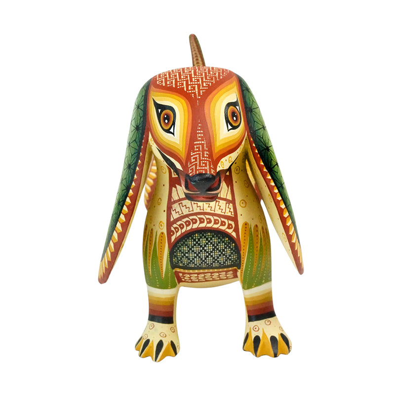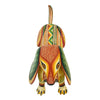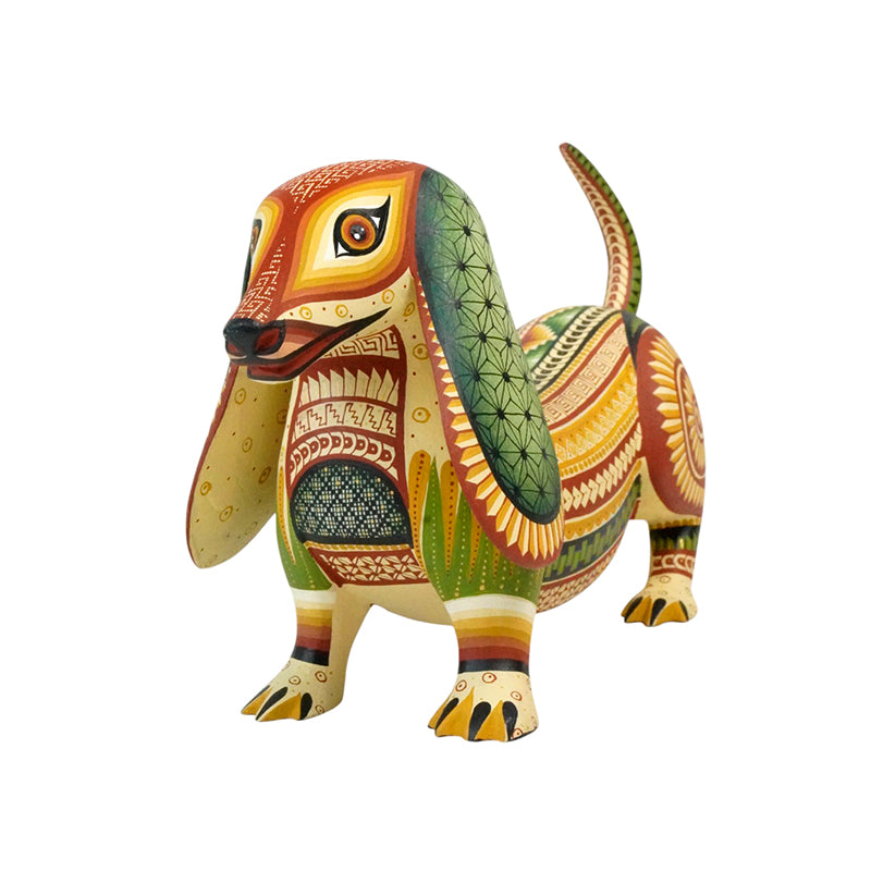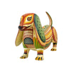This stunning woodcarving by Oaxaca artist Ivan Fuentes transforms the humble dachshund into a work of art, celebrating both form and color. Carved from a single piece of copal wood, its elongated silhouette and gently curved spine evoke the breed’s playful spirit. Every inch of the body is meticulously hand-painted with a masterful array of geometric motifs, spirals, chevrons, and interlocking patterns that dance seamlessly across the surface.
