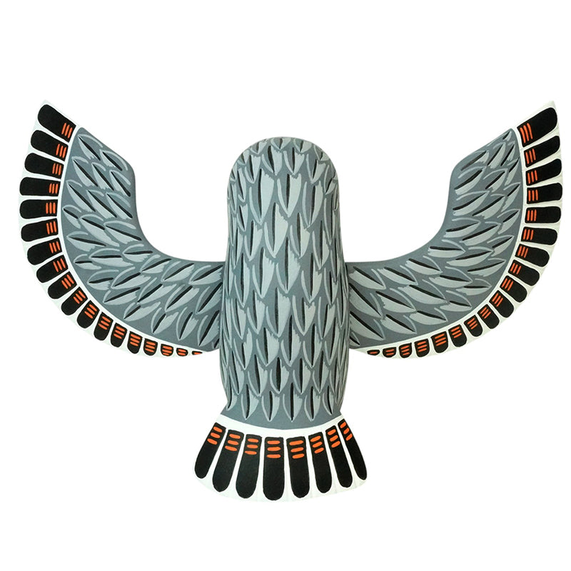 Luis Pablo masterfully painted the feathers in shades of soft grey with striking black and orange accents, echoing the owl’s natural plumage while adding a bold, artistic rhythm. Its wide yellow eyes, rimmed in blue, stare with piercing intensity, a hallmark of Luis Pablo’s expressive style. Even the talons, painted in sharp black and white, give the sculpture a sense of strength and precision.