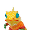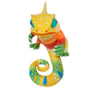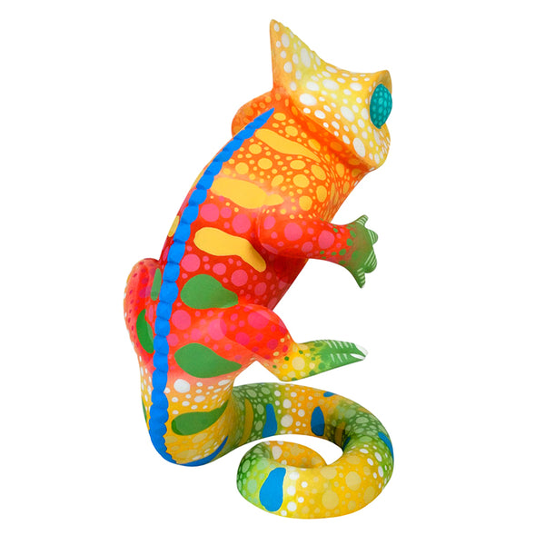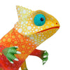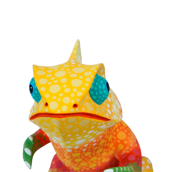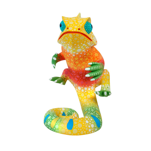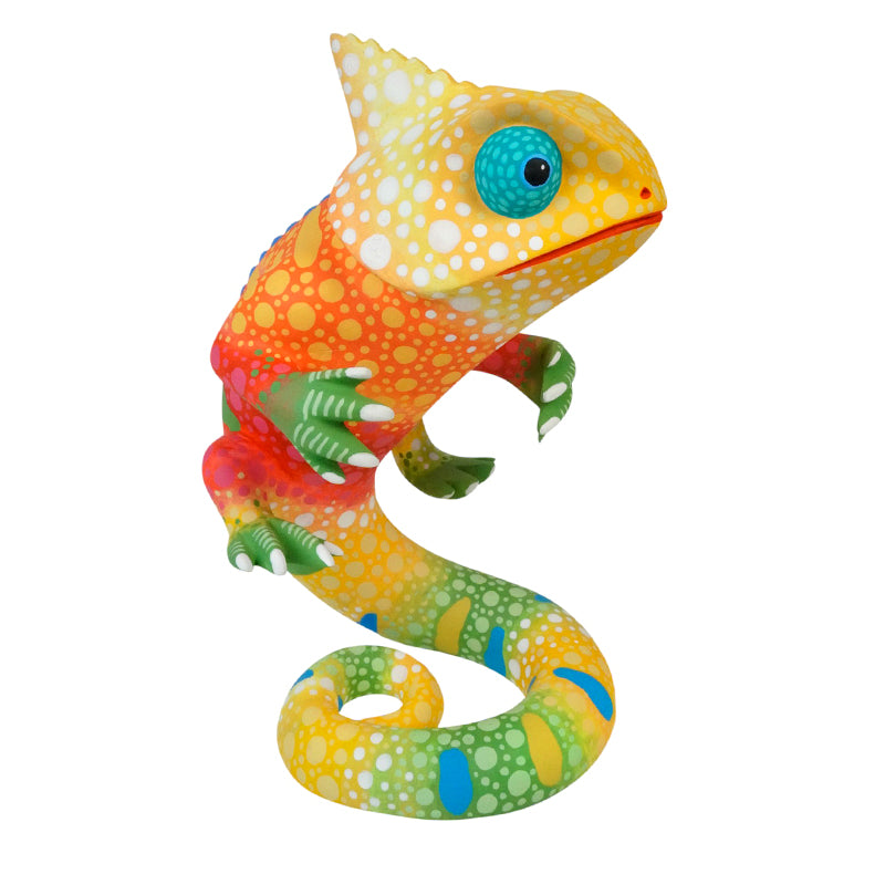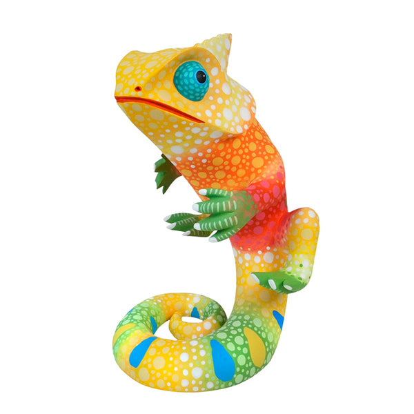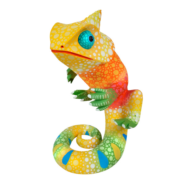 This captivating chameleon sculpture by renowned Oaxacan artist Luis Pablo comes alive with a graceful blend of form and color. Expertly carved from copal wood, the piece captures the distinctive curves and alert posture of a chameleon. Its coiled tail and poised limbs lend the sculpture an air of playful curiosity and graceful movement.