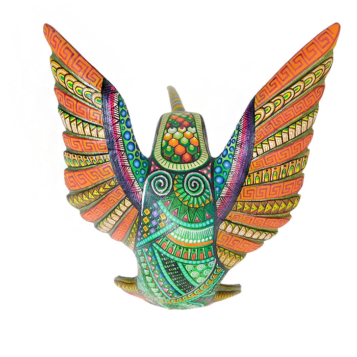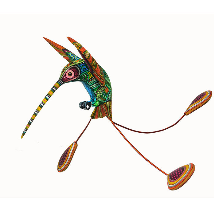 Manuel Cruz and his wife Ruvi are master carvers and very creative and innovative artists in Oaxaca. This time, they created a spectacular Marvelous Spatuletail suspended by its characteristic long tail with leaflike feathers. The tail is three decorated, flexible wires with Zapotec leaf-like feathers. The cords are detachable. The Marvelous Spatuletail is very well carved and graceful, and Ruvi's painted design is superb! We include a mounting ring if you want to hang this beautiful piece.