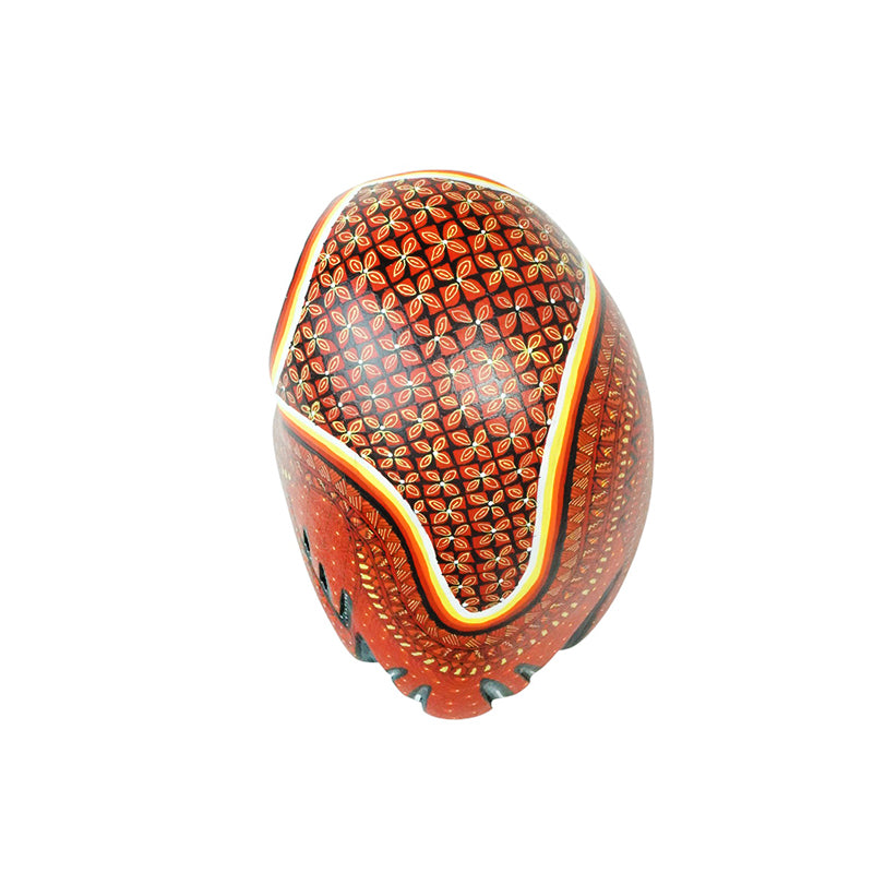 Every pattern, fine scale, cross-hatched texture, and geometric motif is executed with steady, confident strokes that give the figure both rhythm and depth. The deep ochre tones contrast beautifully with the silvery feathers around the eyes, creating a mesmerizing sense of life within the stillness.