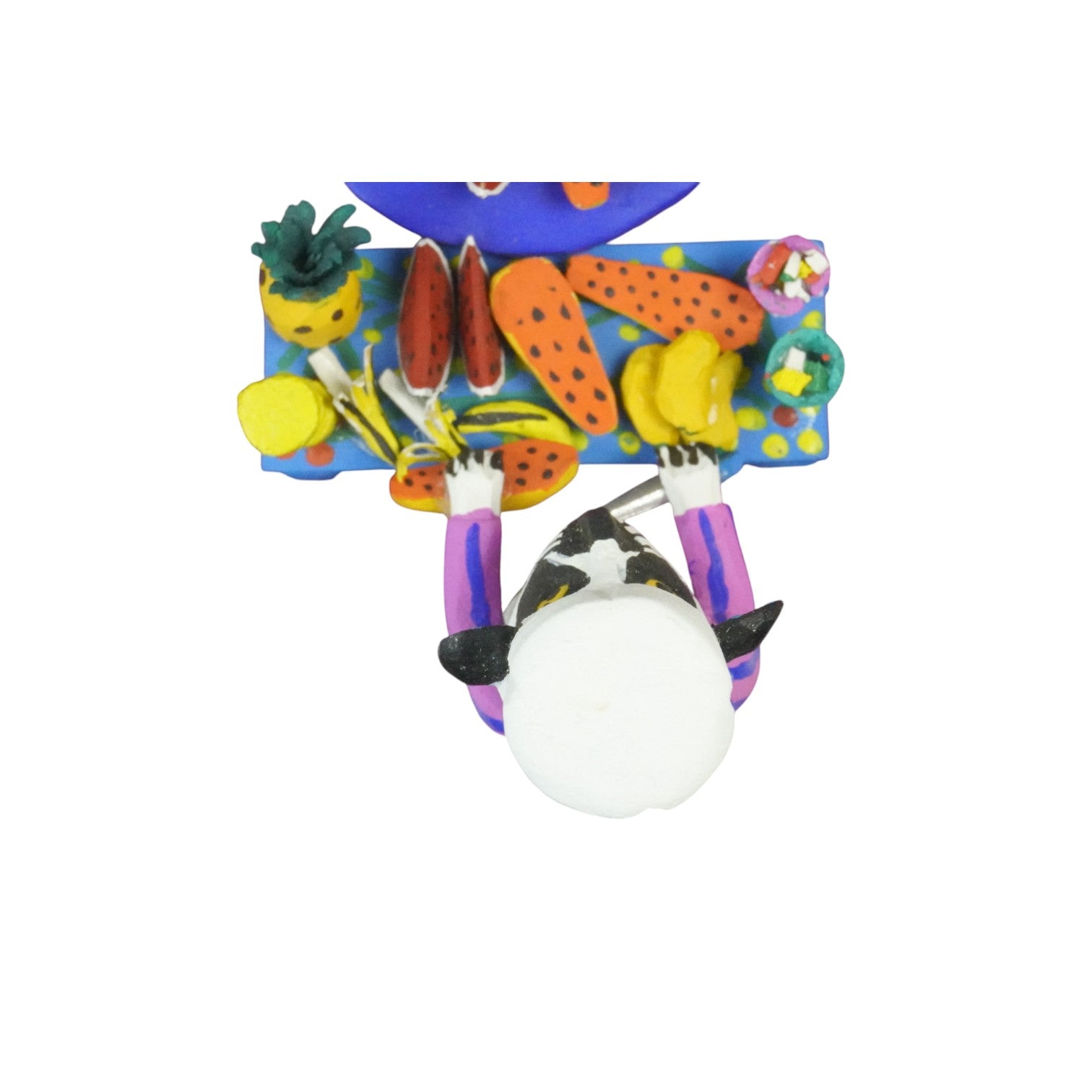 Maximano Santiago, a woodcarving artist from La Union, Oaxaca, created this fantastic scene of four animal friends, including a Panda Chef having a delicious tropical fruit feast. Maximino included mangos, pineapples, watermelons, and a banana...this is such a fabulous Folk Art piece!