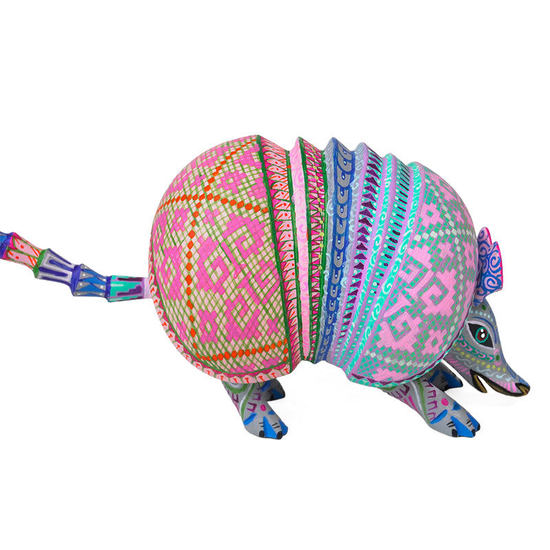 This gorgeous little armadillo seems to have stepped straight out of a Zapotec fantasy storybook. Hand-carved and painted with gentle pinks, lilacs, turquoise, and spring green, its shell features extremely tiny, textile-like patterns that appear almost woven instead of simply painted. Each band of the armor showcases a different design, revealing new motifs—such as zigzags, diamonds, and tiny fretwork—creating a dynamic, patchwork quilt effect as you turn the piece.
