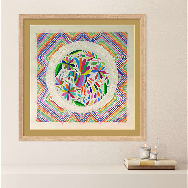 Beautiful mixed media wall art peacock. Handcrafted bark paper made in Puebla, Mexico. The center is a cloth embroidery of a peacock with flowers hand embroidered in Tenango Puebla and placed at the center of the moist paper. The colorful paper strips are added individually when the paper is still wet. Enchanting!