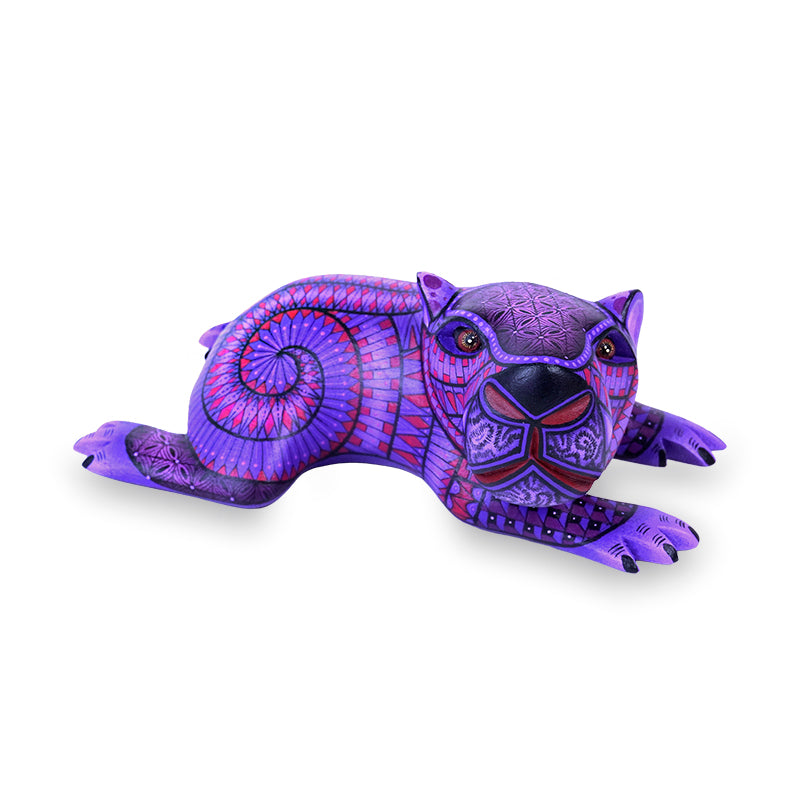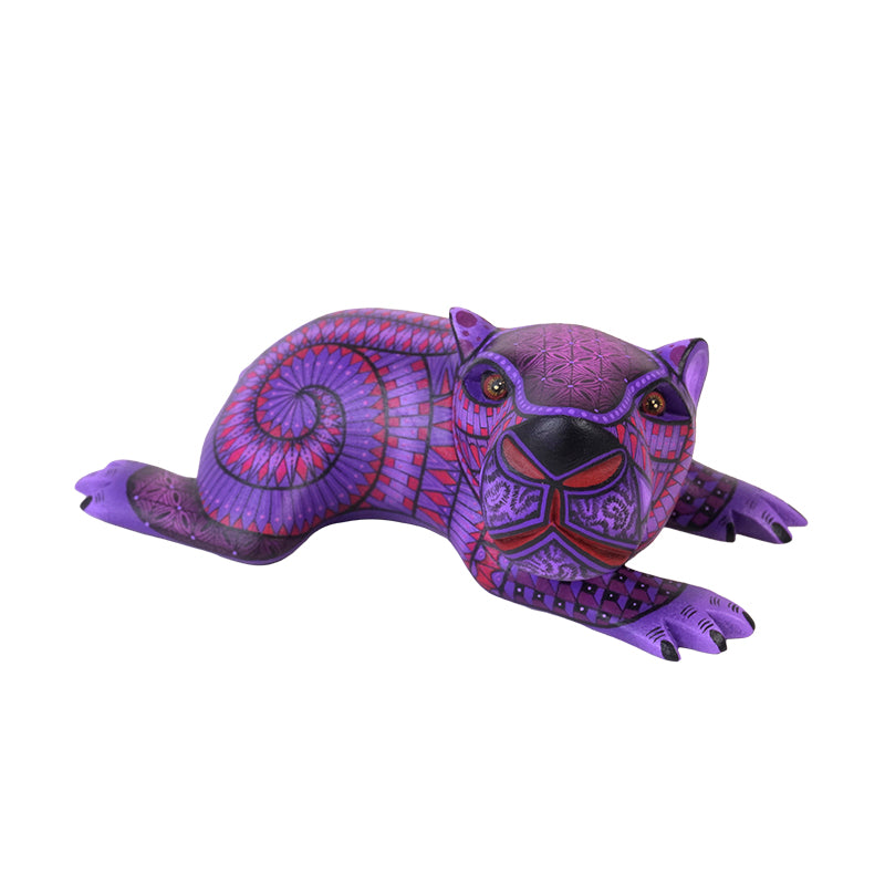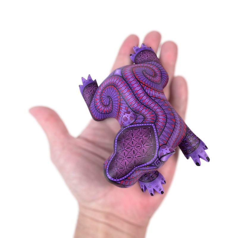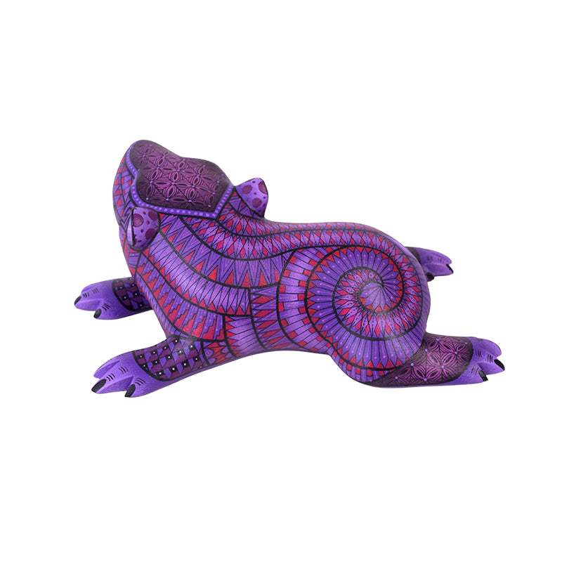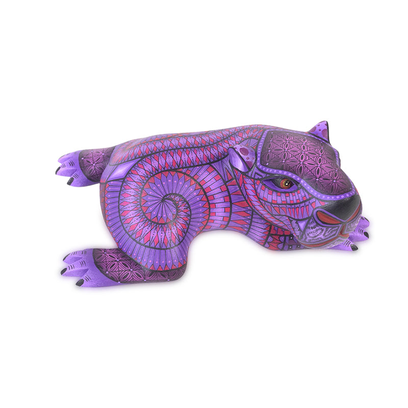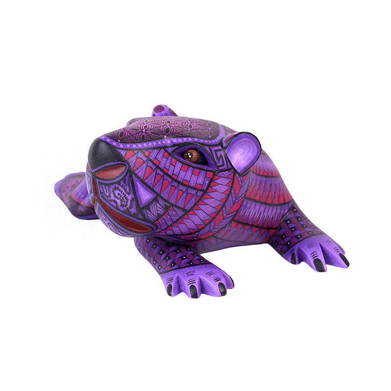 This little baby capybara by Nicolas Morales is pure charm, carved in a relaxed, “I’m not moving” lounge pose, then painted in beautiful purples and magentas with hypnotic spirals and crisp, mosaic-like geometry that keeps your eyes bouncing around the surface. The face is so expressive!