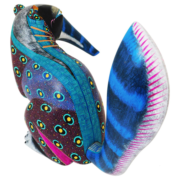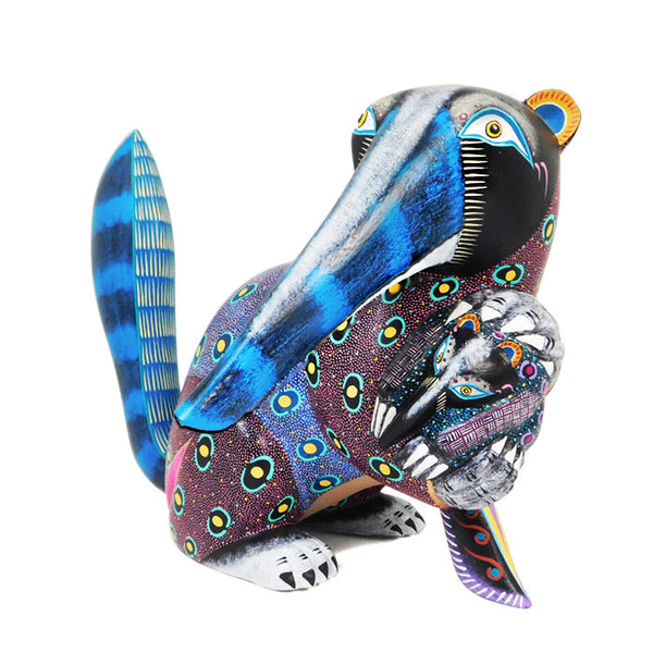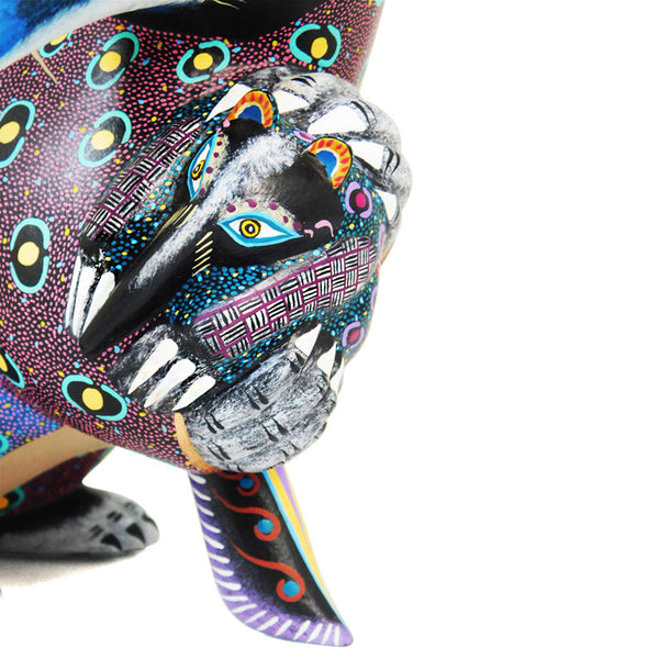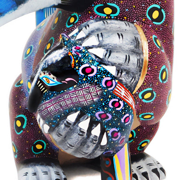 Wonderful one-piece anteater protecting its baby by Oaxacan artist Max Morales. Max is the brother of Nicolas Morales and is well-known for his beautiful, exceptional woodcarvings. This anteater mother is magnificently carved, portraying a sense of fierce protectiveness and alertness. A very elegant piece!