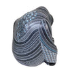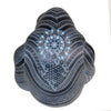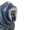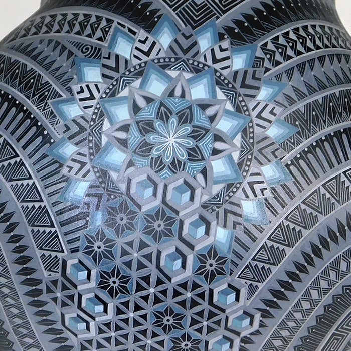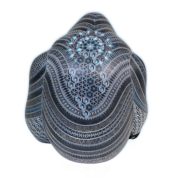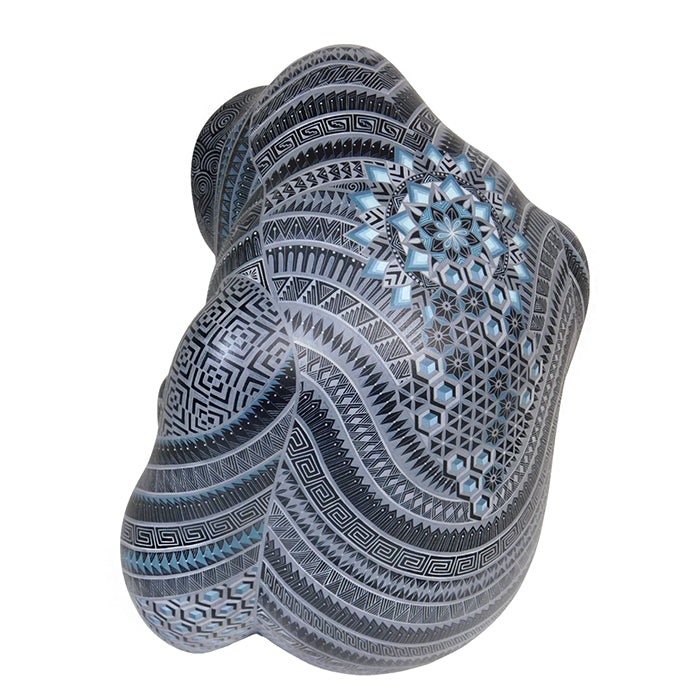 The design follows the anatomy. Bands of pattern wrap with the shoulders, arms, and chest, so the decoration enhances the sculpture’s volume rather than sitting on top of it. The palette is limited to blacks, grays, white, and cool blues, with smooth gradients around the face that calm the expression and keep the focus where it belongs. There is a clear visual hierarchy; the luminous medallion on the back draws you in, the flowing bands guide your eye, and the quieter face lets the personality read immediately.