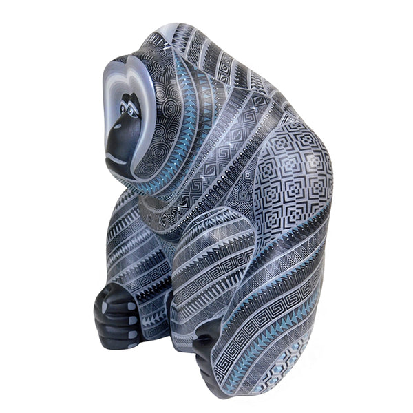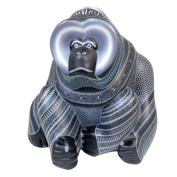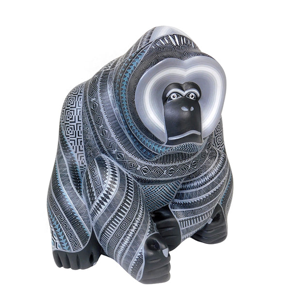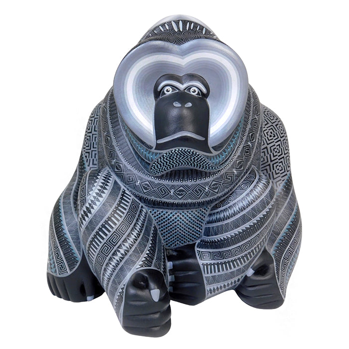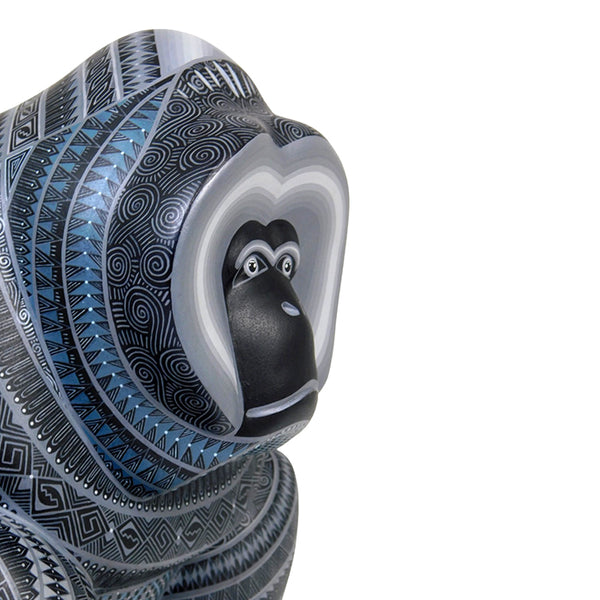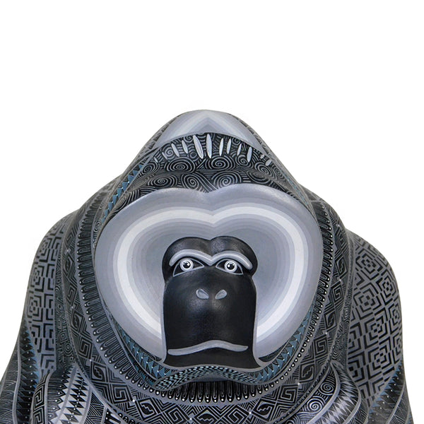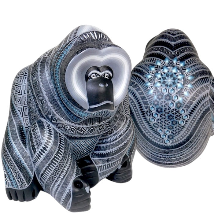 This gorilla alebrije by Pedro Carreño is one of my favorites because every decision on it is so disciplined and smart. The back holds a perfectly centered rosette built from concentric petals, triangles, and hexagons that stay symmetrical across a curved body. The micro-painting is immaculate: clean, even lines and dots, crisp meanders and chevrons, and tiny motifs that never wobble. I love the hexagonal fields that are shaded into cube-like forms; they create depth without any carving, just careful control of artistic balance.