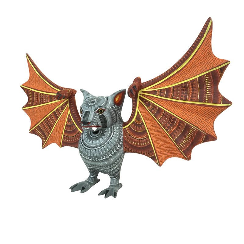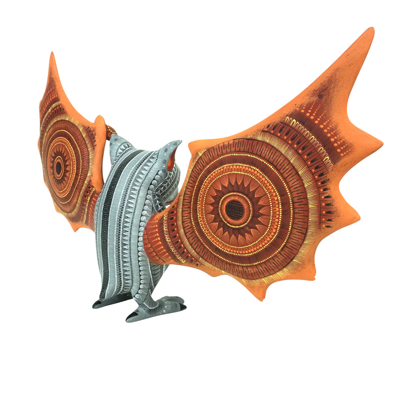 Bats are important animals in Mesoamerican culture, creatures of the night, change, and hidden worlds—and Rocío captures that mystery without losing the charm of the alebrije tradition. It’s a piece that feels both ancient and very contemporary, full of strength, balance, and quiet drama.